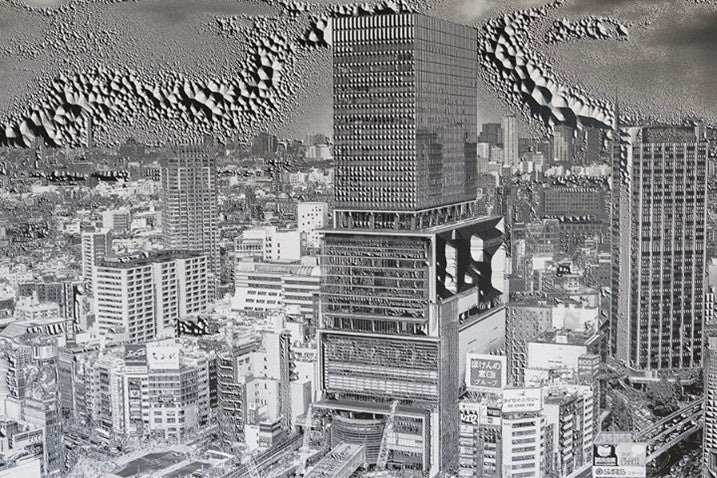 小林健太(b.1992, Japan)は若手写真家として出色の存在です。ルイ・ヴィトンといったラグジュアリーブランドとコラボレーションも多く、コンピューター上で変形・操作したイメージをヴィヴィッドなカラーでアウトプットする作風で有名です。意外なことに、リコーとのコラボレーションではモノクロームの色彩を選択しました。東京・渋谷に暮したことが作家にとってかけがえのない経験であり、その渋谷の風景をモチーフとして記憶が結晶になっていく様を立体的に表現します。