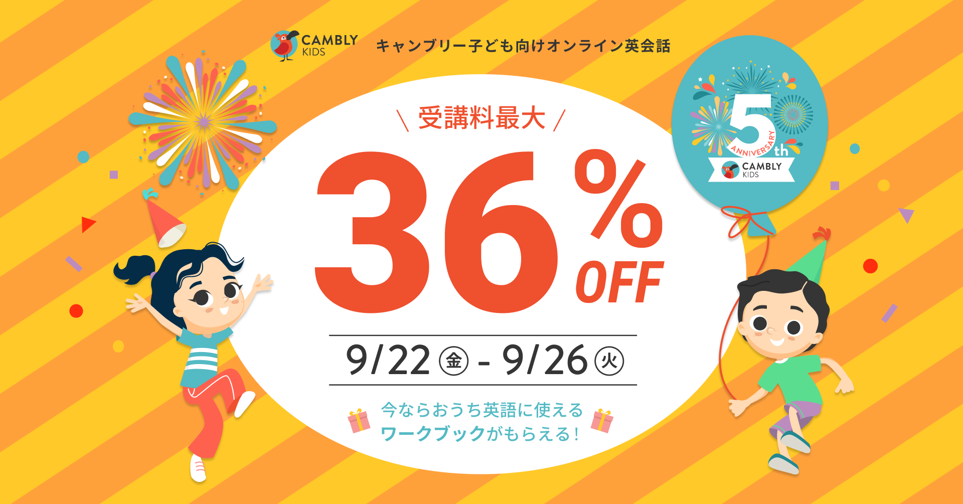 経験豊富なネイティブ講師から英語を学べる子ども向けオンライン英会話「Cambly Kids」は、おかげさまで9月にサービス提供から5周年を迎えました。これを記念してさまざまなイベントを開催してきたAnniversary monthの締めくくりに、最大36%オフの5日間限定セールを開催します!