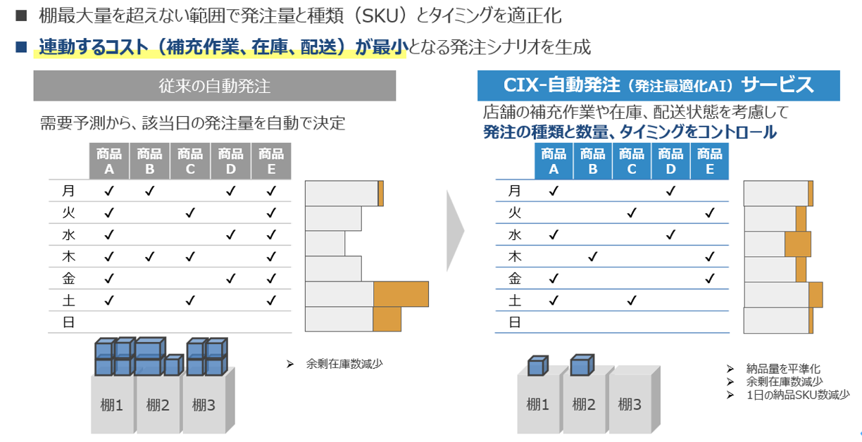 本ソリューションはAIとデジタルツイン技術により、従来の自動発注と比較して発注業務の効率化や過剰在庫抑制にとどまらず、店舗側の補充作業などのオペレーションコストを削減することができます。