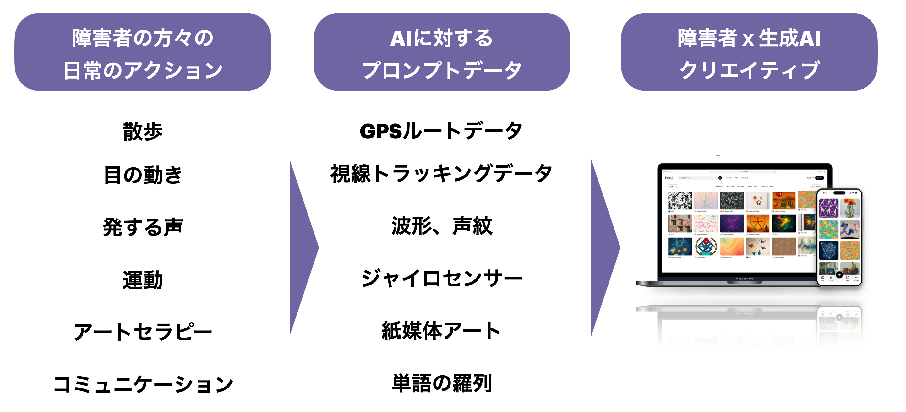 PoteerのAIは、視線の動き、歩行の軌跡、声のリズムなどの行動データを解析し、企業で実際に採用される業務品質のデジタルクリエイティブへと変換します。これにより、障害のある方がデザイナーとして働き、価値を生み出す新しい雇用モデルを実現します。