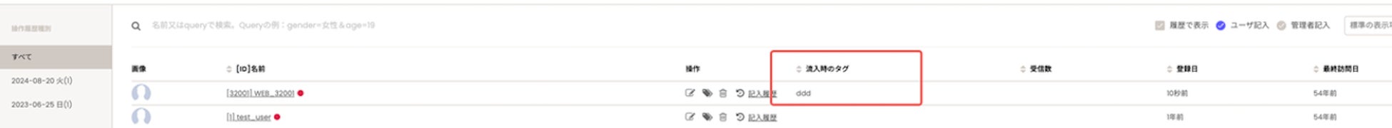 友だち登録をした経路を示す「流入時タグ」。今までのanybotでは、このタグを表示できるのは「ユーザ画面」に限られていました。