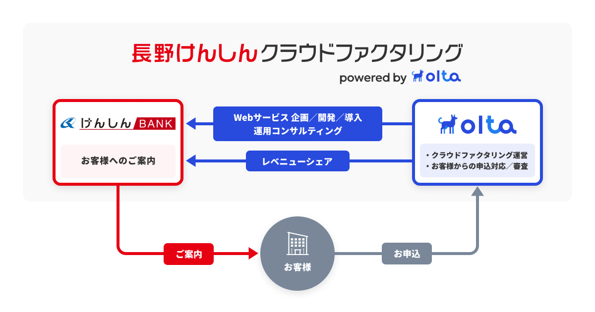OLTAと長野県信用組合とのクラウドファクタリング事業における提携では、OLTAがWebサービスの企画・開発・導入および運用におけるコンサルティングを長野県信用組合に提供し、長野県信用組合は法人・個人事業主のお客様にサービスをご案内します。