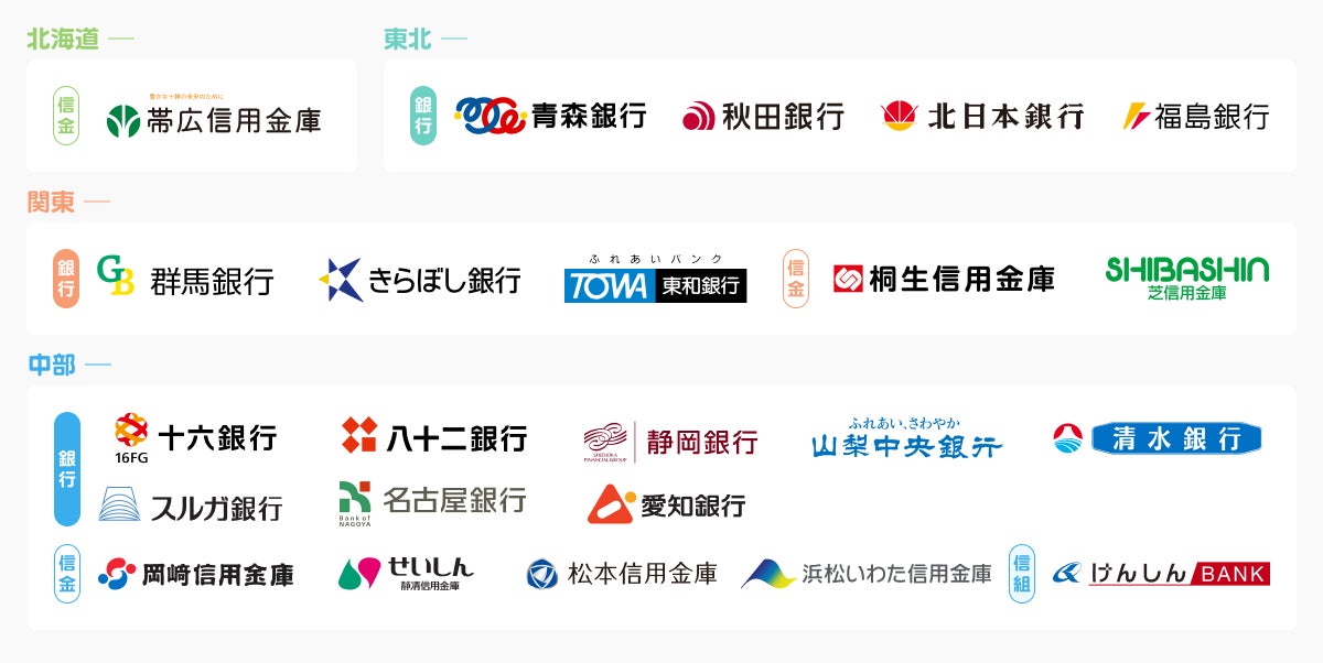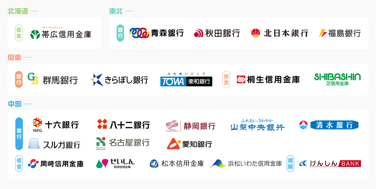 芝信用金庫、帯広信用金庫、岡崎信用金庫、北伊勢上野信用金庫、静清信用金庫、大阪商工信用金庫、松本信用金庫、玉島信用金庫