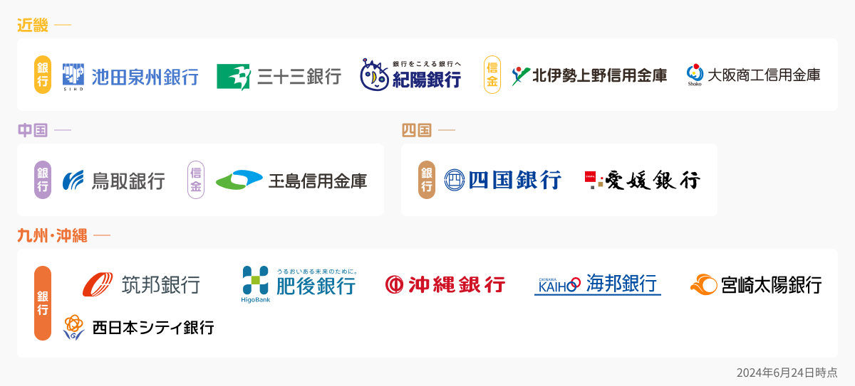 鳥取銀行、筑邦銀行、八十二銀行、肥後銀行、四国銀行、池田泉州銀行、秋田銀行、三十三銀行、愛媛銀行、北日本銀行、沖縄銀行