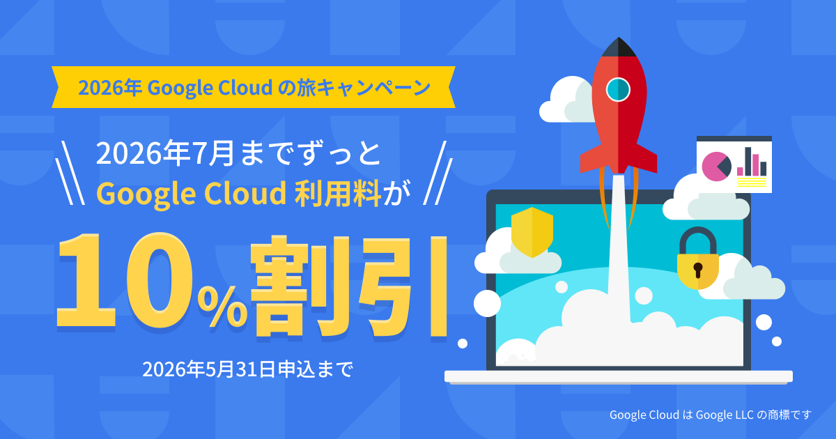 2026年5月31日までに「C-Chorus Google Cloud 請求代行サービス」へ初めてお申し込みいただくお客様を対象に、2026年7月31日までの Google Cloud の利用料金を10%割引でご提供します。