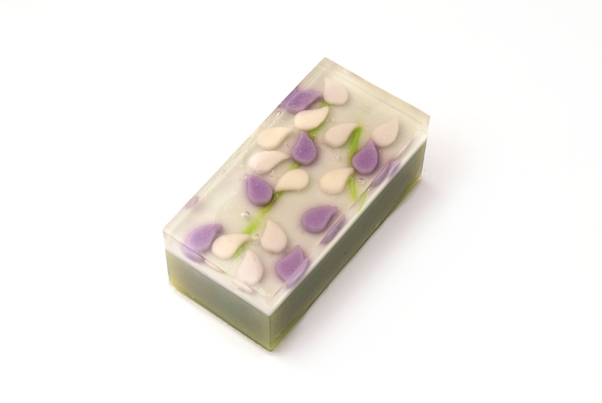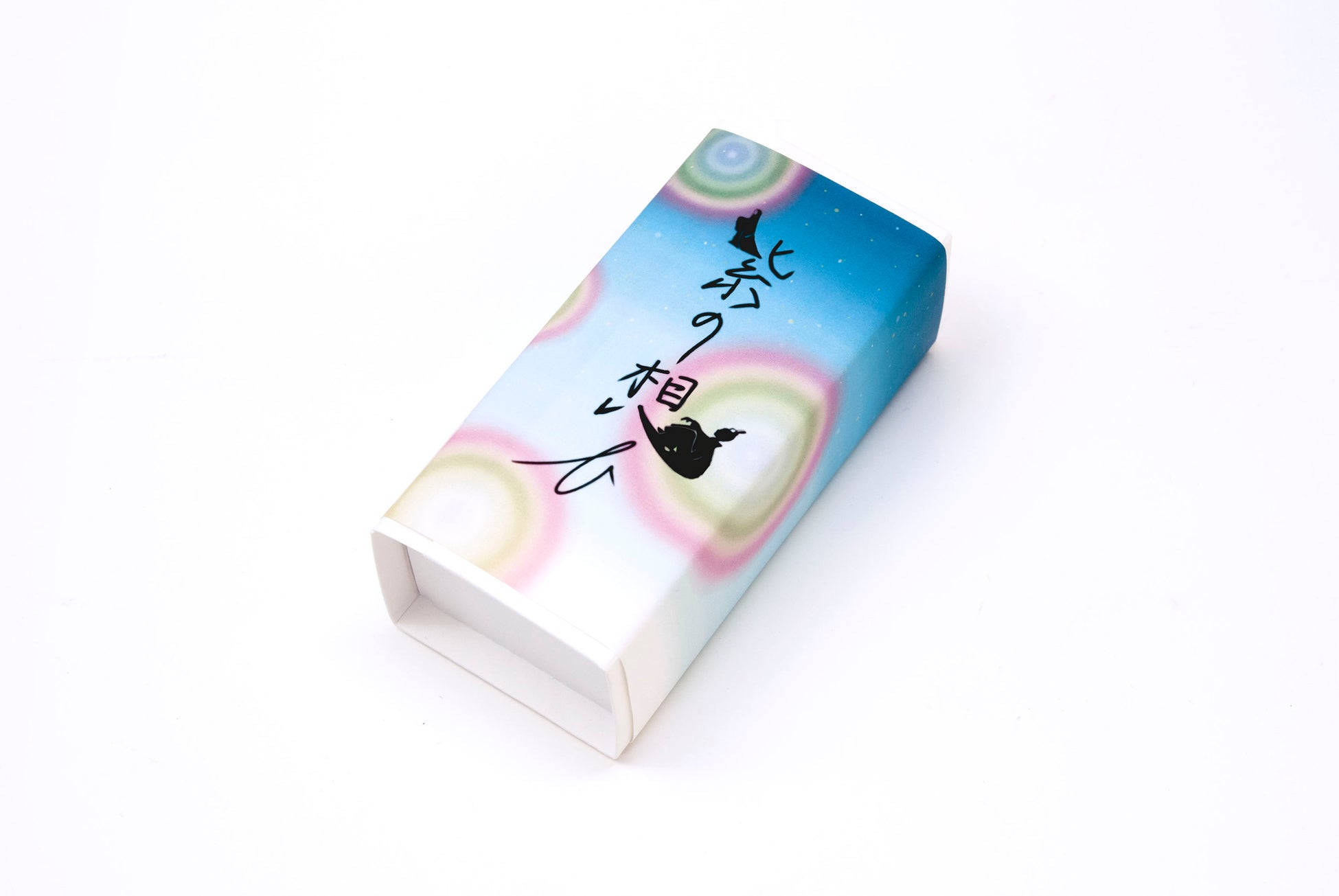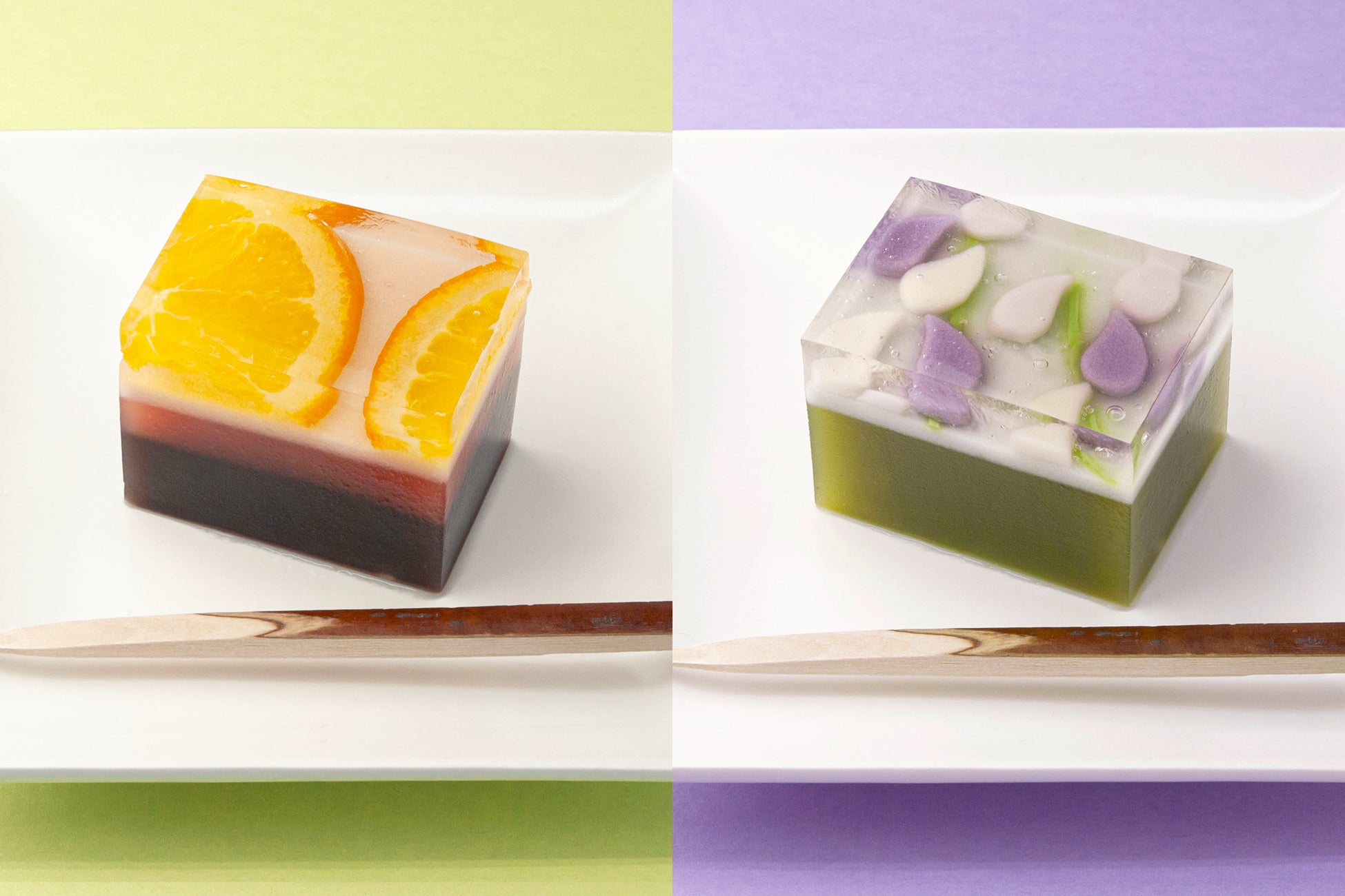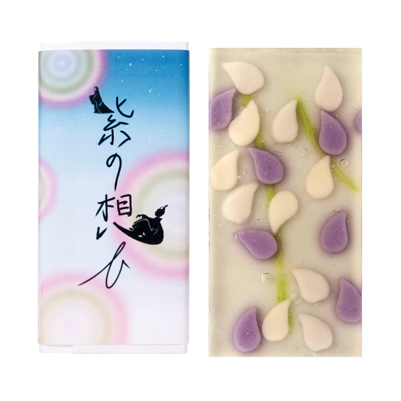 「源氏物語」がテーマ。作品全体を結びつける「紫」の色のイメージ、作者の紫式部が「藤式部」と呼ばれていたことや、 藤の花言葉「恋に酔う」「決して離れない」のフレーズをあわせて、美しい藤の花をお菓子のモチーフとしました。お茶の香り高い抹茶羊羹と琥珀羹の二層羊羹には、爽やかな色合いとともに、涙のしずく形にアレンジした藤の花の意匠をあしらって登場人物の切ない想いを表現しています。