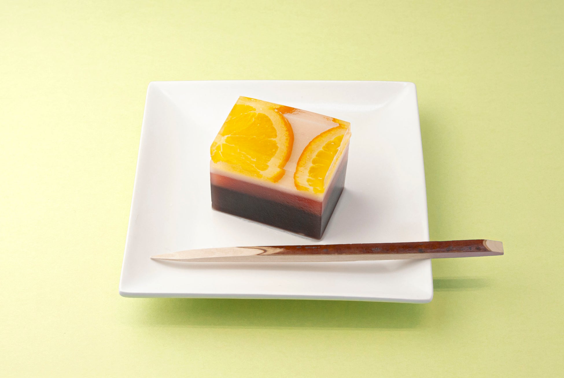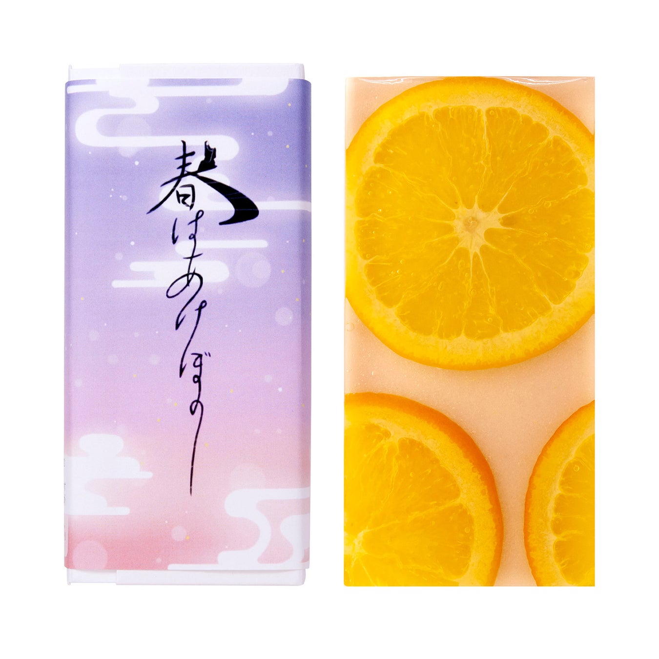 「枕草子」がテーマ。有名な一節「春はあけぼの。やうやうしろくなりゆく山ぎは…」から発想し、山のむこうにあざやかな朝焼けが見える情景、その時間帯の美しさそのものをお菓子であらわしました。上品な甘さのこしあん羊羹と紅色の羊羹を重ね、こしあんの色はまだ夜が明ける前の山々を、ほのかな紅色で朝日が差し込む山際を表現し、透きとおる琥珀羹には朝焼けの太陽をあらわすオレンジの輪切りをこめました。