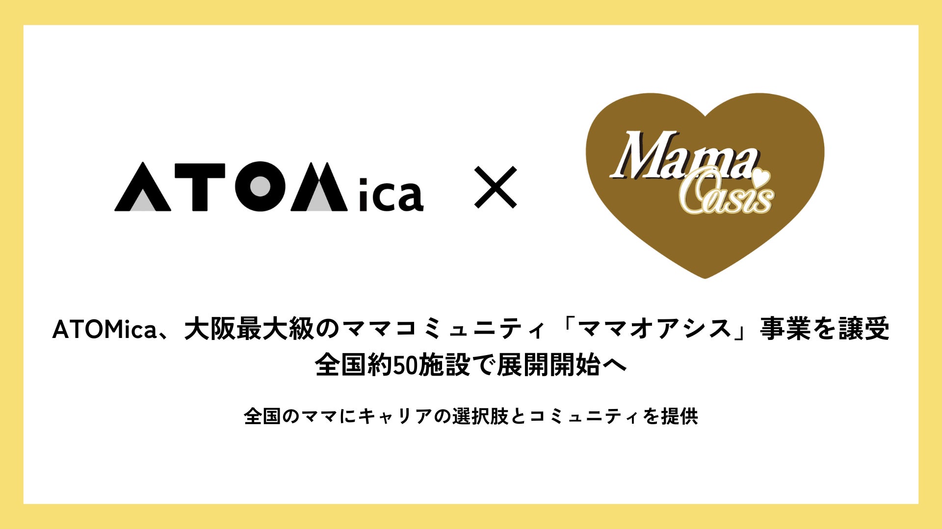 ソーシャルコワーキング®︎スタートアップの株式会社ATOMica(本社:宮崎県宮崎市、代表取締役Co-CEO:嶋田瑞生、南原一輝、以下「ATOMica」)は、大阪を拠点に約5,000人のママコミュニティを有する特定非営利活動法人ママオアシス(所在地:大阪府堺市、代表理事:檜垣葵、以下「ママオアシス」)から「ママオアシス」事業を譲受したことをお知らせします。