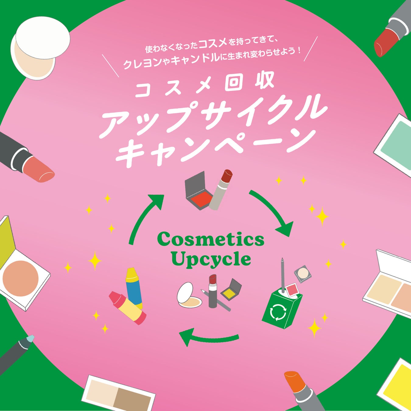 使わなくなったコスメの回収と、当社の推進するサステナブルな取り組みを紹介するパネルを展示。回収したコスメは後日クレヨンやキャンドルにアップサイクルします