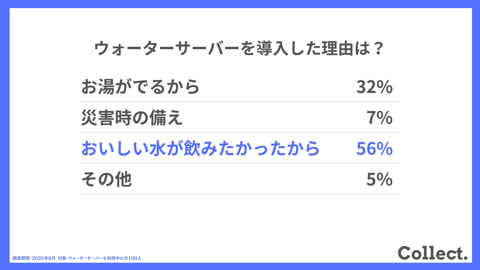 導入の理由は56%が「おいしい水」を求めて。ウォーターサーバー導入の背景・決め手を調査【Collect.(コレクト)】