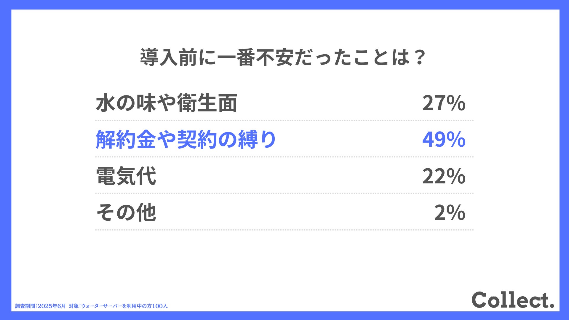 「解約金や契約の縛り」が半数近くを占め、「水の味や衛生面(27%)」や「電気代(22%)」を大きく上回りました。申し込み時には、契約条件の分かりやすさと説明の明確さが重要なポイントとなります。