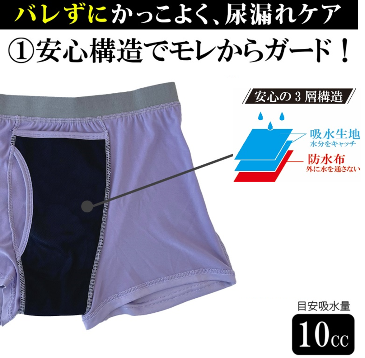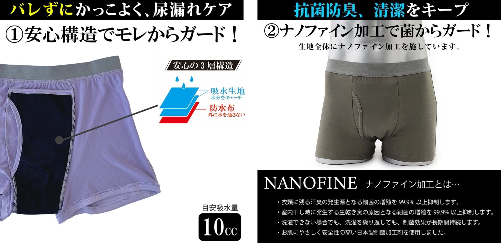 実際尿漏れ経験のある男性が多いことが判明し、そんな男性たちの日々の生活を快適にできる商品をと思い、そこで見た目もかっこよく、身体の悩みをケアできる、尿漏れパンツを考えました。