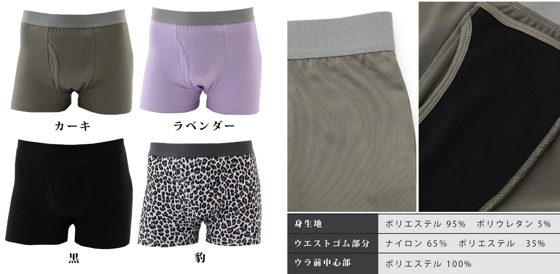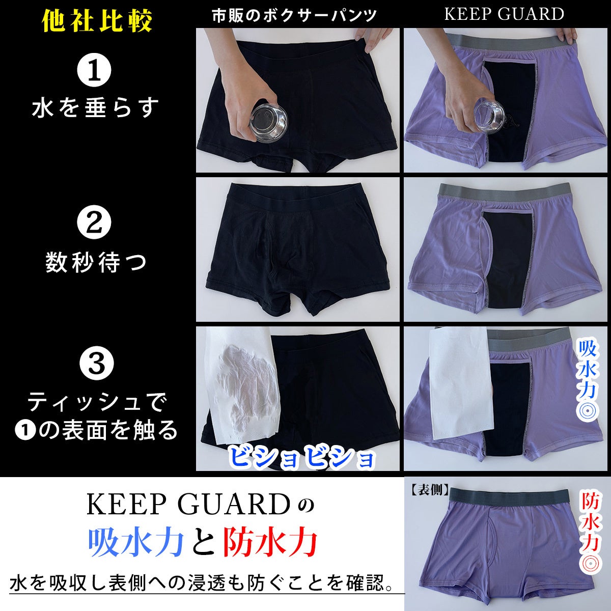 「KEEP GUARD」は、男性のちょい漏れの悩みを解決する、尿漏れ対策パンツです。2層の吸水生地と防水布からなる3層構造と、汗臭発生源となる細菌の増殖を99.9%抑制するナノファイン加工でしっかりガード。ブラック/カーキ/ラベンダー/ヒョウ柄の4色展開で、かっこよくそしてバレずに尿漏れケアができるアイテムです。