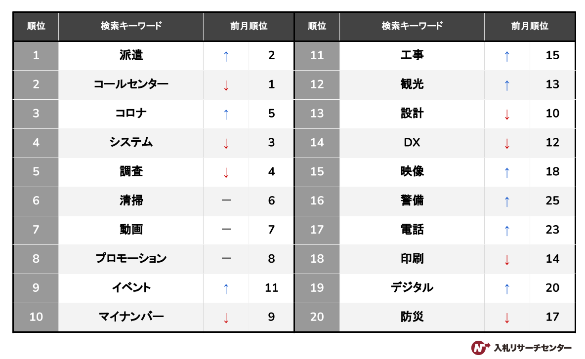 検索回数NO.1は「派遣」となりました。「コロナ」「警備」「電話」なども順位を上げました。