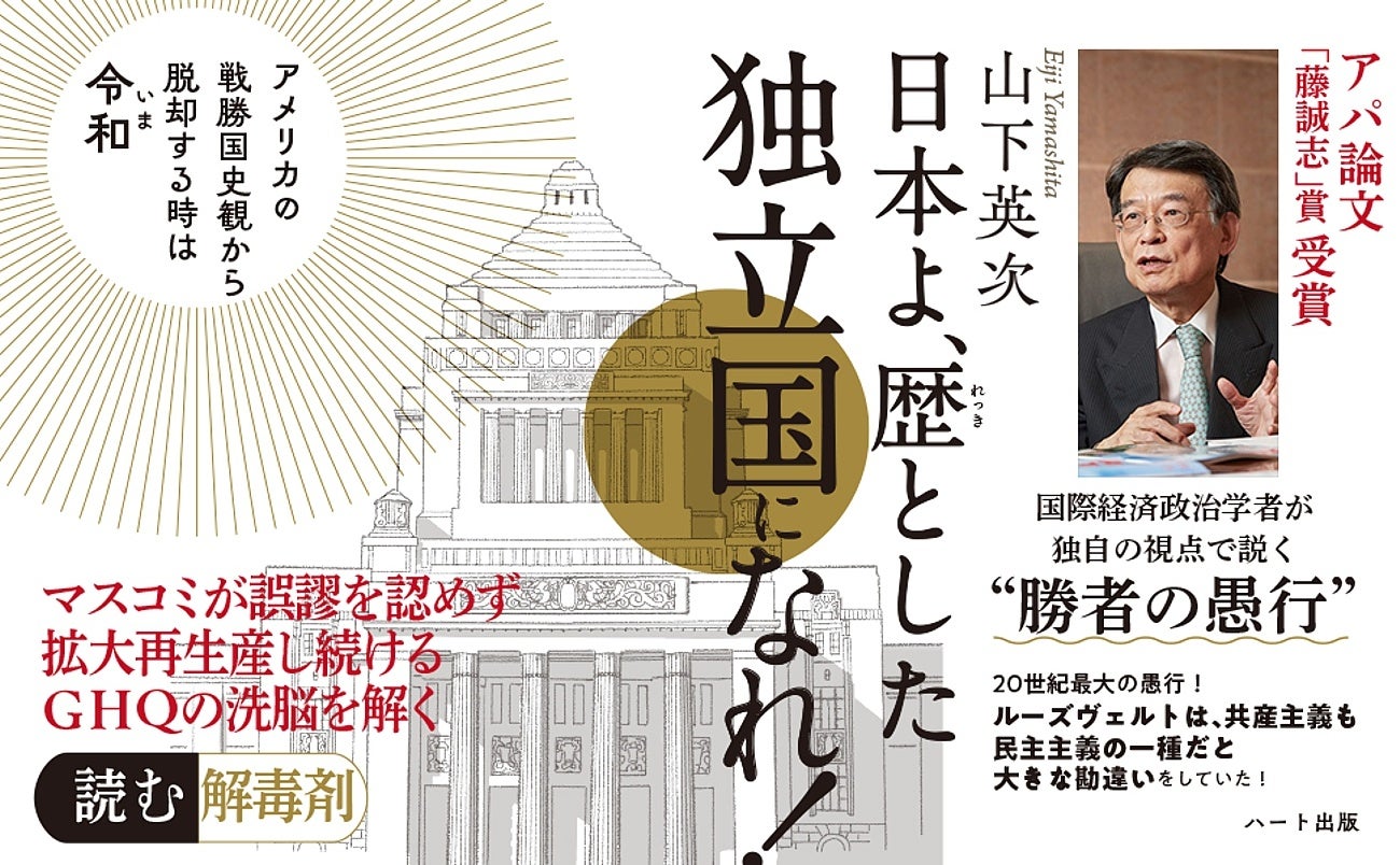 アパ日本再興大賞とは、誇りある祖国である日本の成長発展に資する近現代史、国際関係、政治・政策等の分野における研究を促すとともに、優れた研究成果を広く周知するための賞です。10月12日、そのノミネート作品4点が選ばれました(大賞は10月下旬開催の審査委員会で決定)。そのうちの1点が、9月にハート出版から刊行された『日本よ、歴とした独立国になれ!』です。