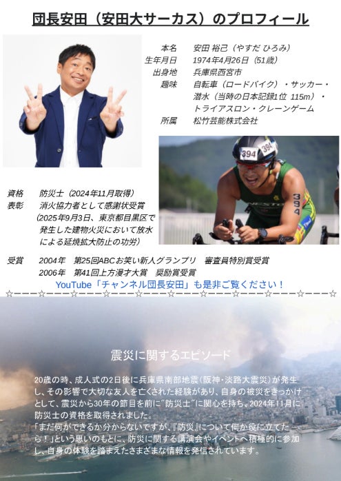 当日は、お笑いタレントで防災士の資格を持つ団長安田(安田大サーカス)さんを講師に迎えます。