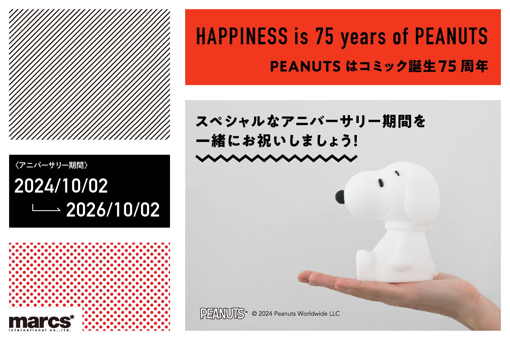 2024年10月2日~2026年10月2日まで、PEANUTSコミックの誕生75周年を記念したアニバーサリー期間となっております。このスペシャルな期間を、一緒にお祝いしましょう!