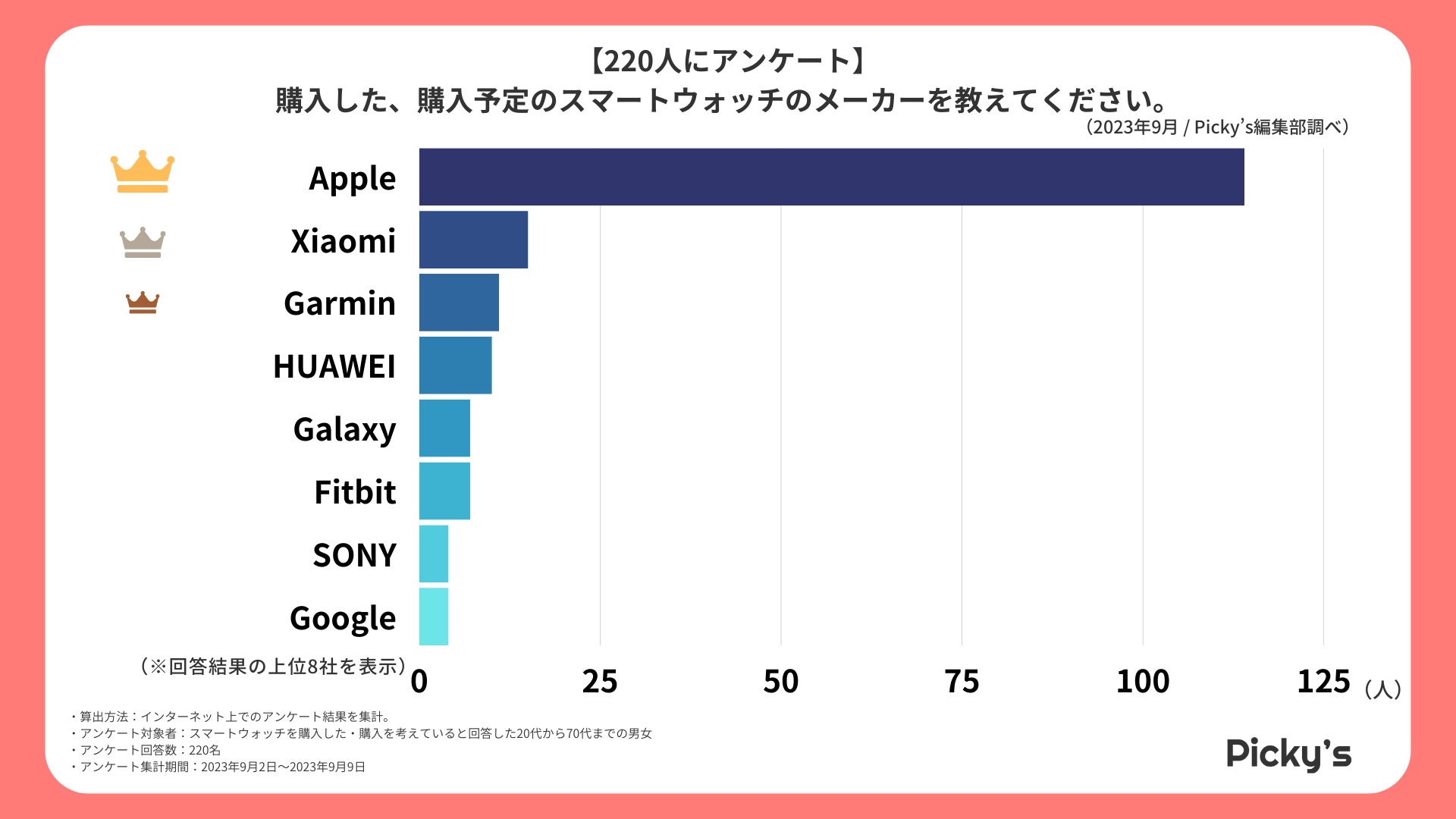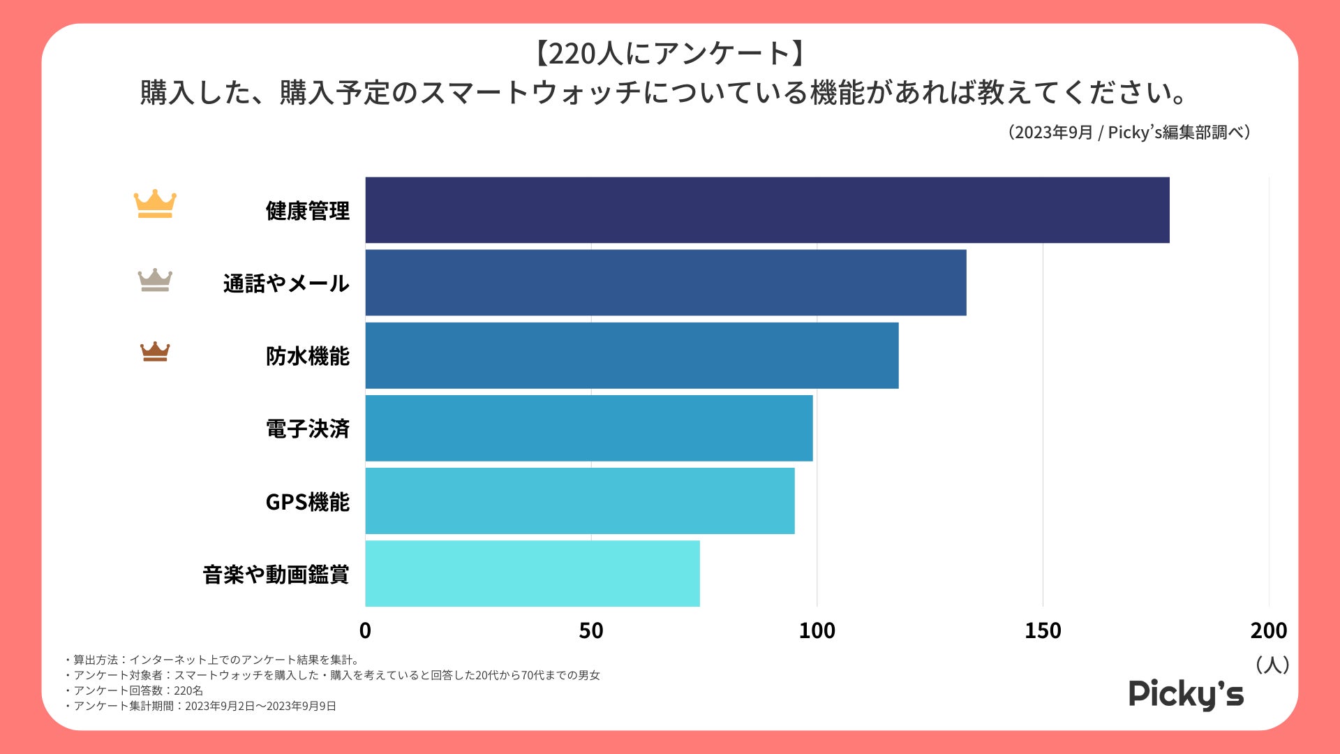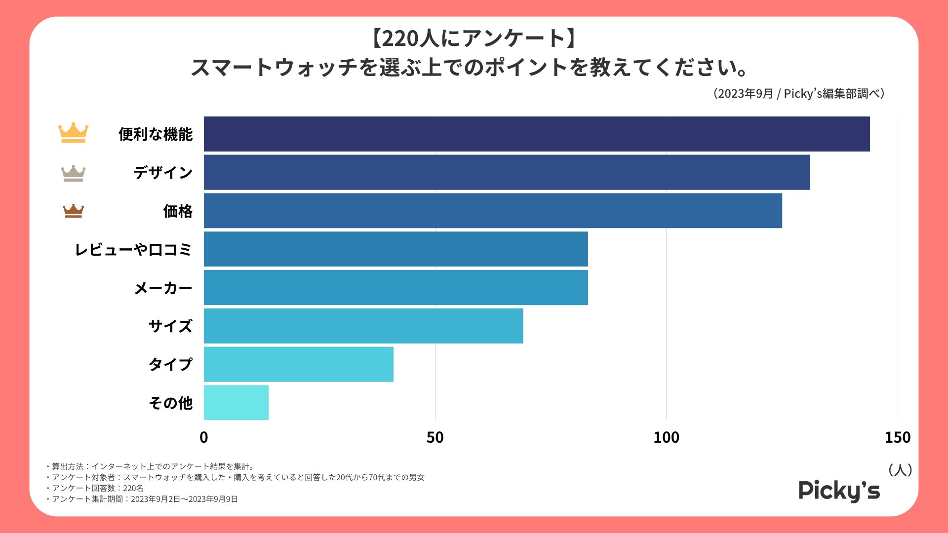 「Picky’s」は、インターネットショッピングにおいて、購入前に試せない・選ぶべきものがわからないという課題の解決を目標に、あらゆる商品のおすすめランキングや検証レビューを紹介するサイトです。このたびPicky’s(https://rentry.jp/note/)では、スマートウォッチについてインターネット上でアンケート調査を行いましたので発表いたします。