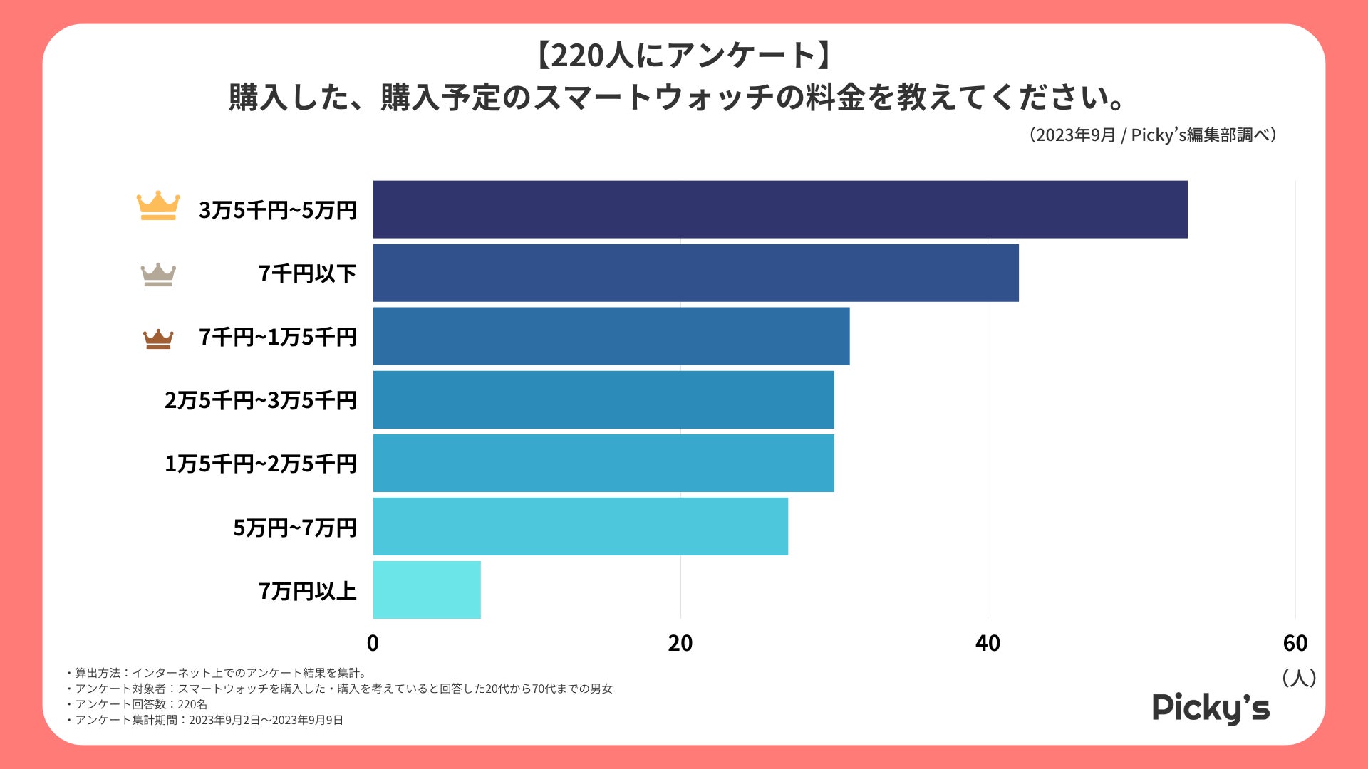 2位から3位は選択肢の中でも1番低い価格「7千円以下」「7千円~1万5千円」も選ばれていることから、低価格帯のスマートウォッチも購入検討の選択肢に含む方も多いようです。