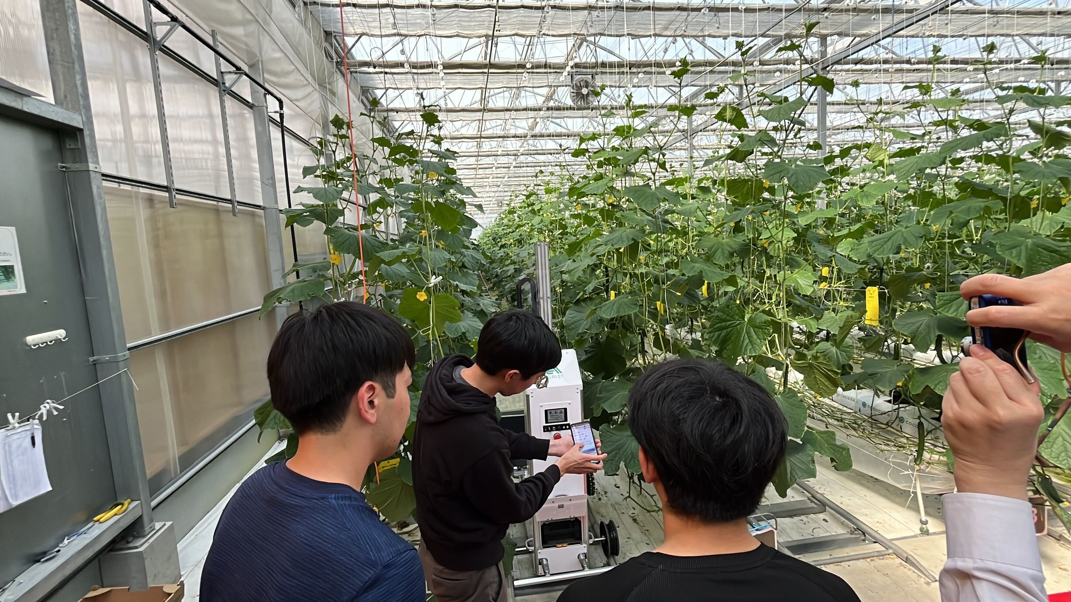 ロボットの開発において、一番困難であったことは収穫ハンドの開発でした。このロボットが対象としているつる下ろし方式の栽培では、キュウリが主枝のすぐ近くに実がなります。収穫の際に誤って主枝を傷つけてしまうと、切った先が成長しなくなり大きな損失となってしまうため絶対に避けなければなりません。茨城県や宮崎県の農家の皆様、そして今回導入して頂いたタカミヤ様の圃場で繰り返しテストをさせて頂き、この課題を解決できる収穫ハンドを開発できたことが、今回の実導入という大きな一歩に繋がったと感じております。今後も開発と改良を続けて、人の介入を最小限にし、自律的に稼働し続ける収穫ロボットの実現を目指して参ります。