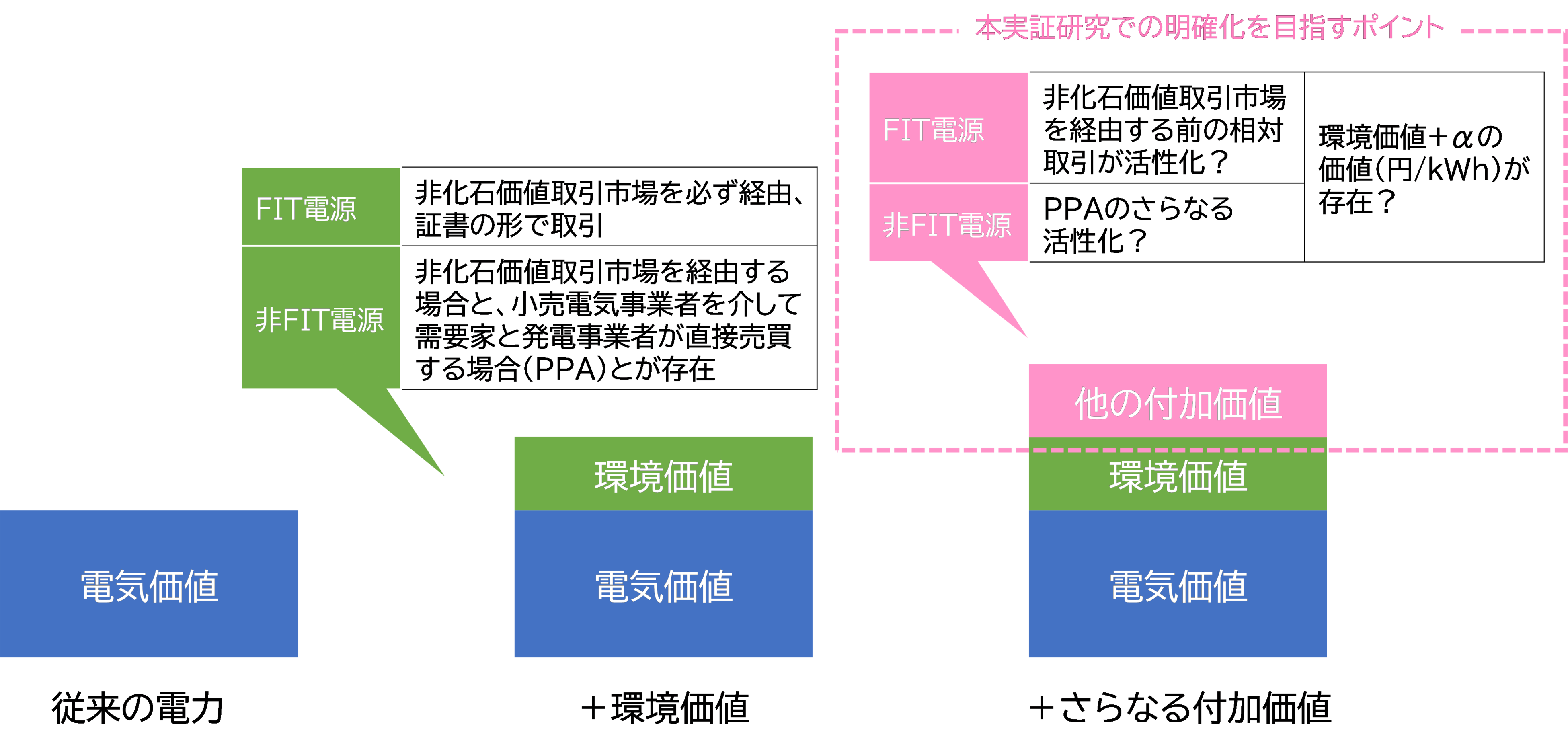 需要家の電力選択が再エネ電力が持つCO2削減価値に加え、その他の付加価値によっても判断され、行動変容を促進するためには、付加価値を可視化・顕在化し、判断指標の一つとして活用する仕組みを構築する必要があります。