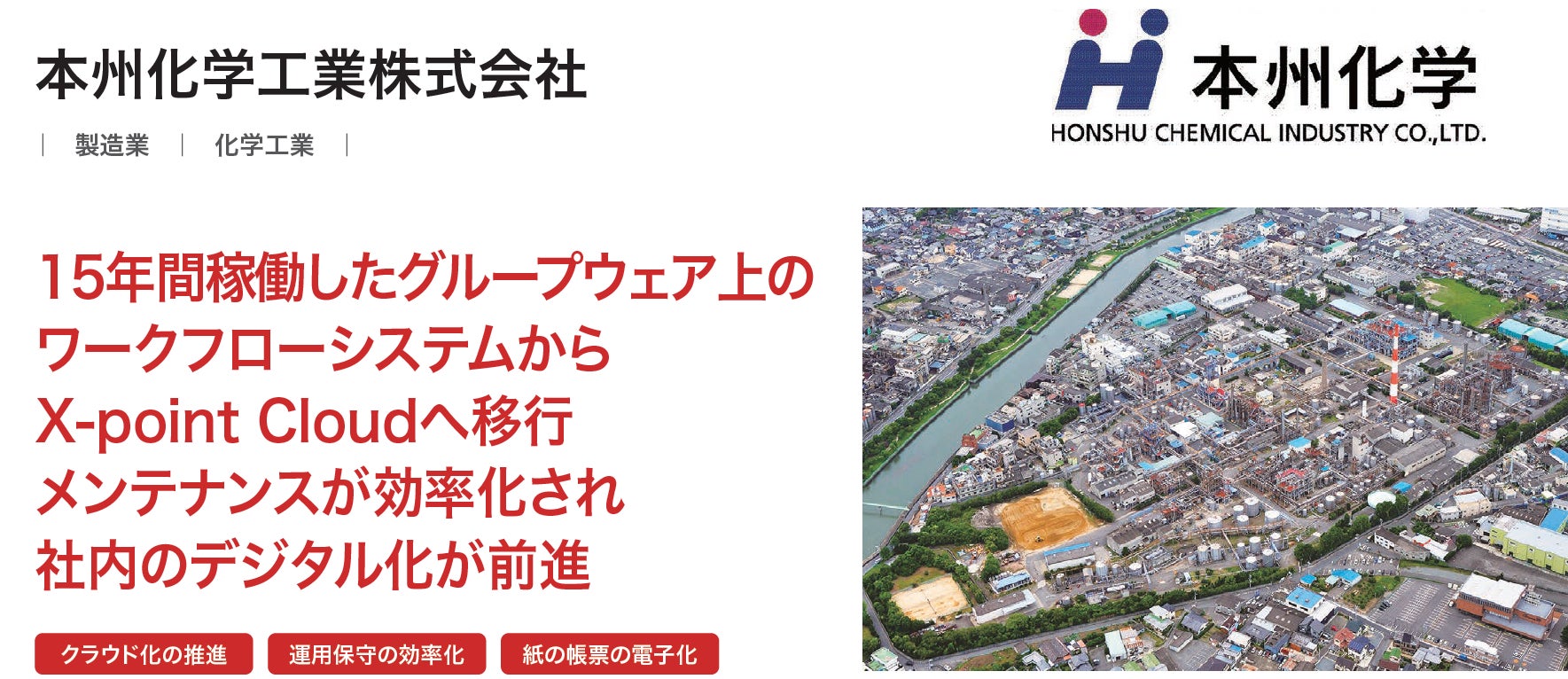 業務手続きの電子化(ワークフローシステム)大手の株式会社エイトレッド(本社:東京都渋谷区、代表取締役社長:岡本 康広 以下、エイトレッド)が提供するワークフロークラウド「X-point Cloud(エクスポイントクラウド)」をご利用いただいている、本州化学工業株式会社(本社:東京都中央区、代表取締役社長:福山 裕二 以下、本州化学工業)の導入事例を公開いたしました。