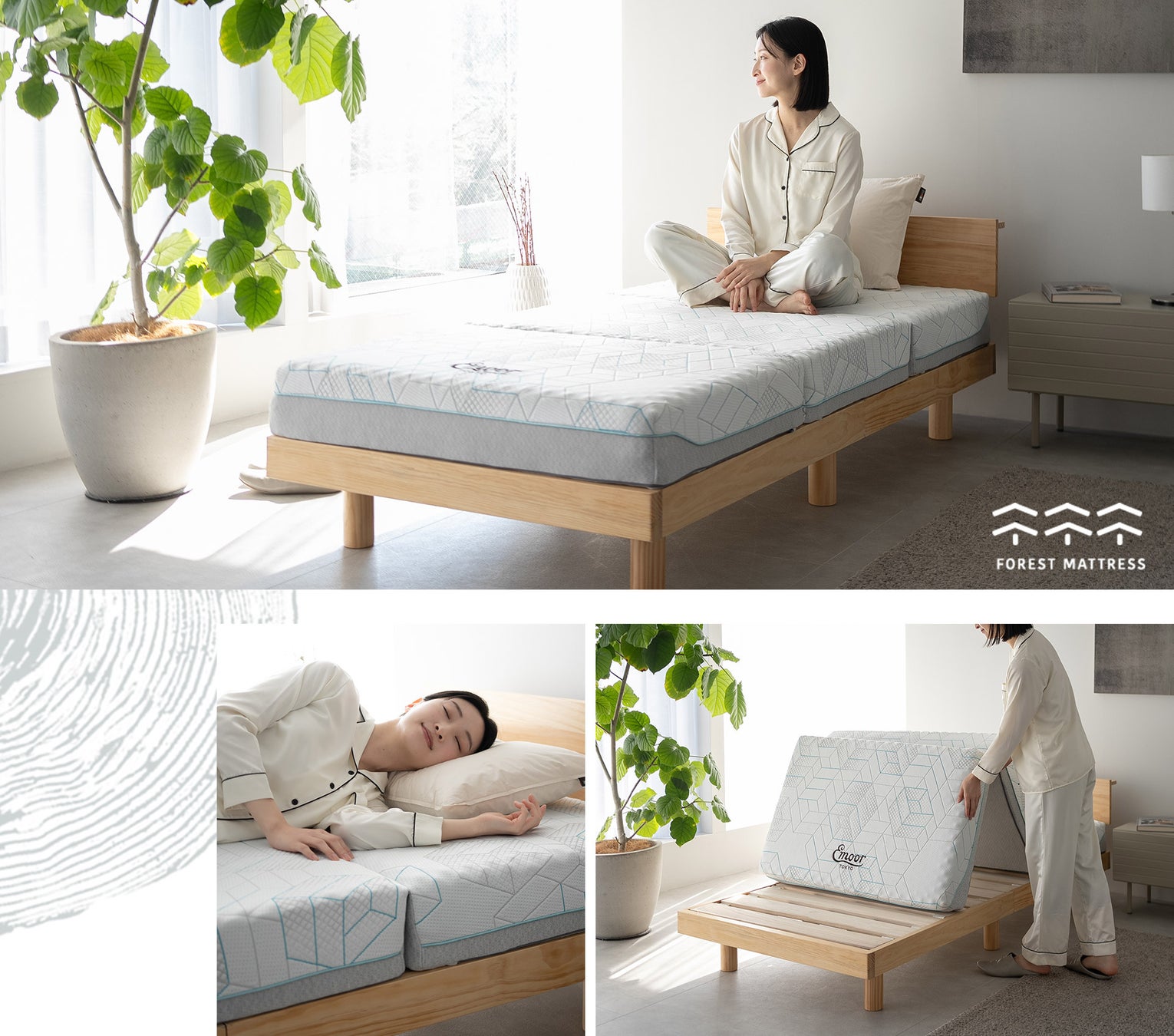 フォレストマットレスは「限られたスペースでも妥協の無い回復を」をコンセプトに作られた、“寝る・座る・たたむ”に高い専門性を持つ健康家具ブランドEMOORの最新作です。寝心地研究で得られた因子「硬さ・沈み込み・弾力性」から逆算して生まれた独自設計と、こだわり抜いた素材で心地よい眠りをお楽しみいただけます。