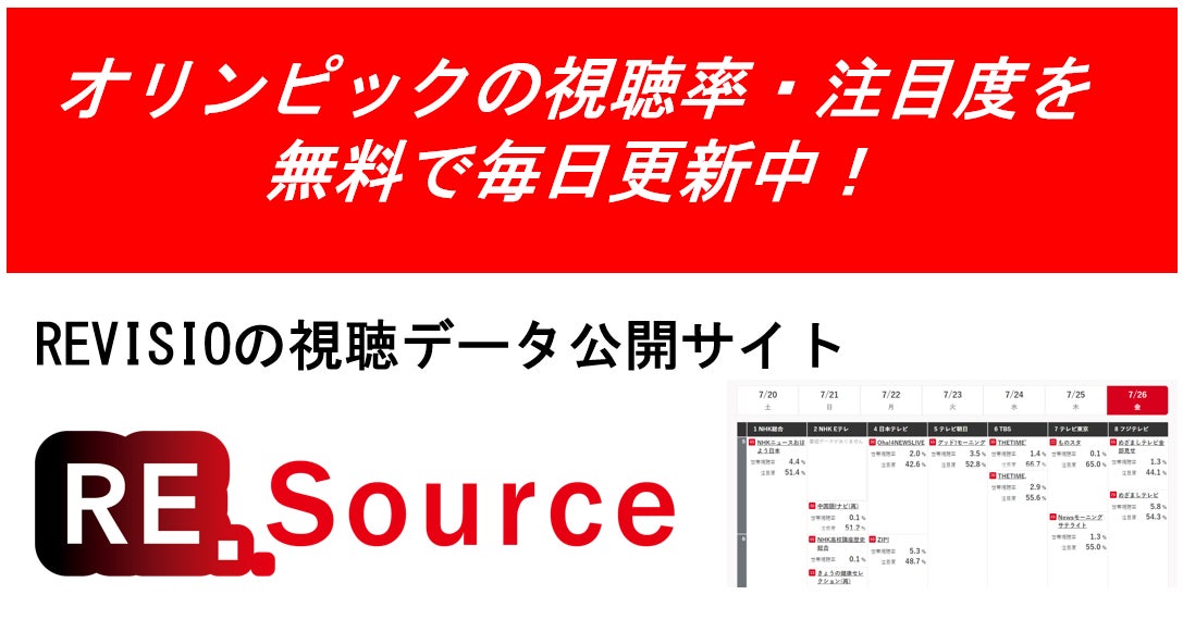 REVISIOの視聴データ公開サイト「RE.Source」では、オリンピック中継を含む過去1週間の関東・関西地域での地上波6局7チャンネルの世帯視聴率・注目度*を毎日更新中。どなたでも無料でご覧いただけます(注目度をご覧頂く際は氏名とメールアドレスの登録が必要です)。ぜひアクセスしてみてください。