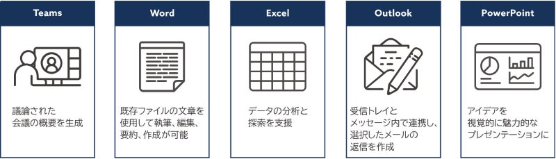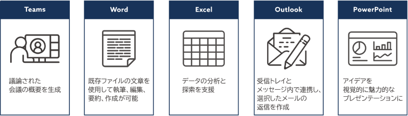 大規模言語モデルをもとに蓄積されたデータと「Microsoft 365」アプリケーションを組み合わせて、利用者の指示や質問に対して効率的に回答をもたらす生産性向上ツールです。マイクロソフトが ”Your everyday AI companion” と表現するように、私たちが毎日使用する Microsoft Teams や Outlook、Word、Excel、PowerPoint といった「Microsoft 365」アプリケーションに組み込まれており、指示や質問に対してリアルタイムに回答を返すことで、効率的に創造性や生産性の向上を実現できるツールです。