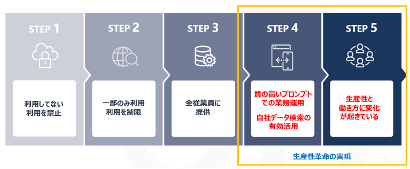 日本において「ChatGPT」が大きな話題となり約半年が経過しました。気軽に利用できるようになった一方で、多くのユーザーは単純な質問や検索だけをお試し利用するステップに留まり、活用段階に至らないことが課題となっています。生産性や働き方において生成 AI による成果を出すには、生成 AI が得意とすることを理解し、的確なプロンプトを投げかけながら、好ましい結果が繰り返し得られるサイクルを作り出し、当たり前に使う段階(=定着)を経る必要があります。企業においてこの循環を作り出すには、活用方法を工夫するだけでなく、セキュアな環境で、検索対象として社内ドキュメント・メール・チャットなども横断的に活用できるようにするなど情報の整備やさまざまな対策も必要となります。
