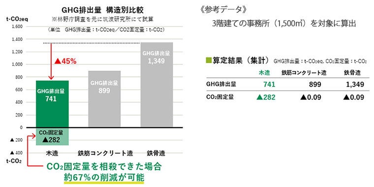 ※3.林野庁調査をもとに住友林業の筑波研究所で試算(以下のグラフと表を参照)。林野庁「平成27年度 木材利用推進・省エネ省CO2実証業務 報告書」の資材数量をもとに3階建て事務所(1,500㎡)の躯体、外部、内部(設備除く)を対象として、新築時から解体時までのライフサイクル全体を対象として算定しました。