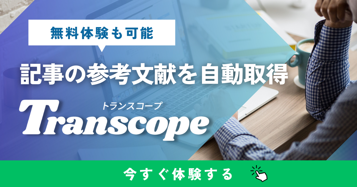 上記のご意見をうけて、Transcopeで生成したコンテンツや記事の参考文献を自動取得する機能をリリースいたしました。当機能により、コンテンツや記事の信憑性を確認したり高める効果が期待できます。