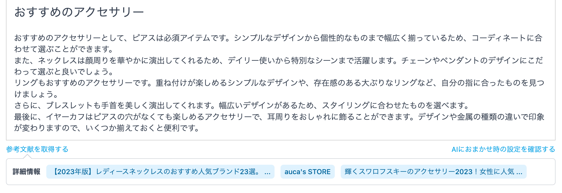 表示された詳細情報のリンクをクリックすると、コンテンツ生成のために参照した情報元のページへ遷移しますので、コンテンツの信憑性を確認することが可能です。