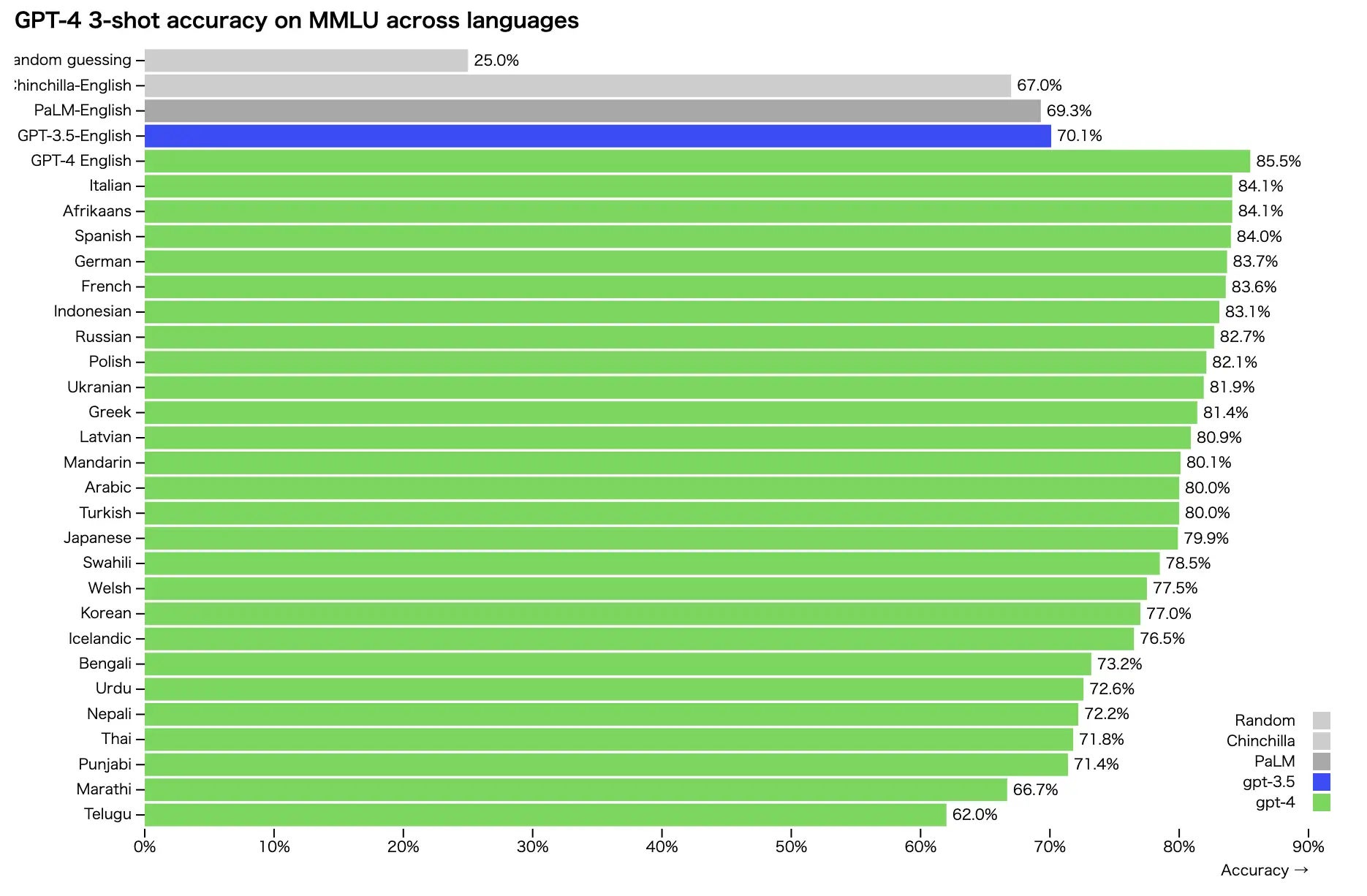 今話題のChatGPT(無料版)で使われているAPIであるGPT-3.5の後継機になります。GPT-3.5と比較すると、様々な観点で精度が向上しており、たとえば日本語の精度においても、GPT-3.5においてはデータ量の関係で英語よりも日本語の精度が劣っておりましたが、GPT-3.5の英語よりもGPT-4の日本語のほうが精度が高い という結果がでております。