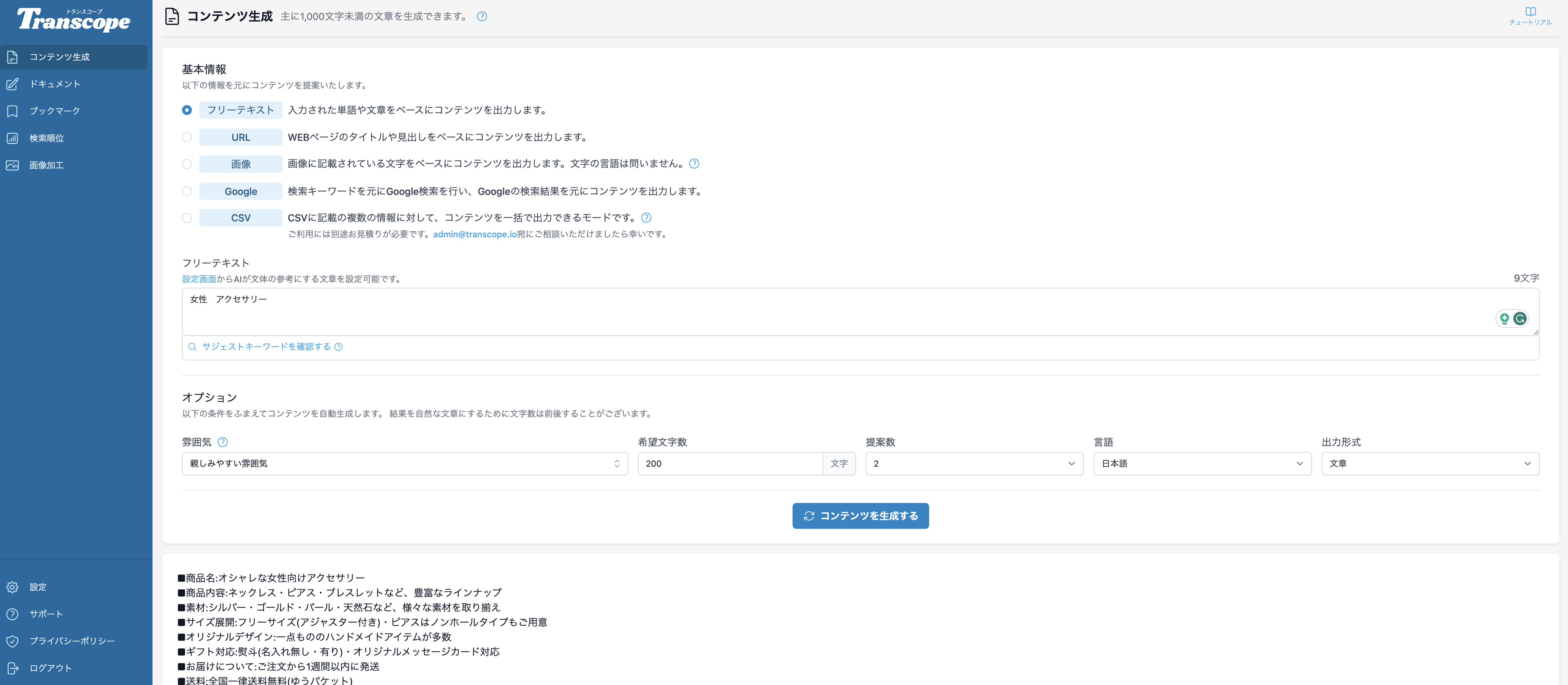 Transcopeの[コンテンツ生成]メニューから、コンテンツを生成していただけましたら幸いです。