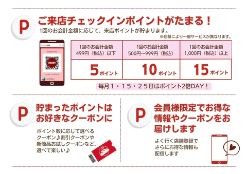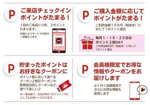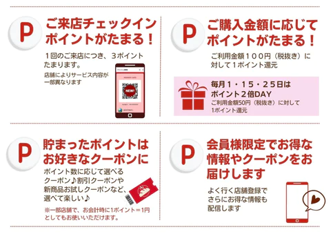 ① スマレジ連携済みの店舗では、購入金額に応じて、自動的にポイントを付与するシステムが実現。さらに1回の来店につき、3ポイントが貯まる『ご来店チェックポイント』も実現しました。