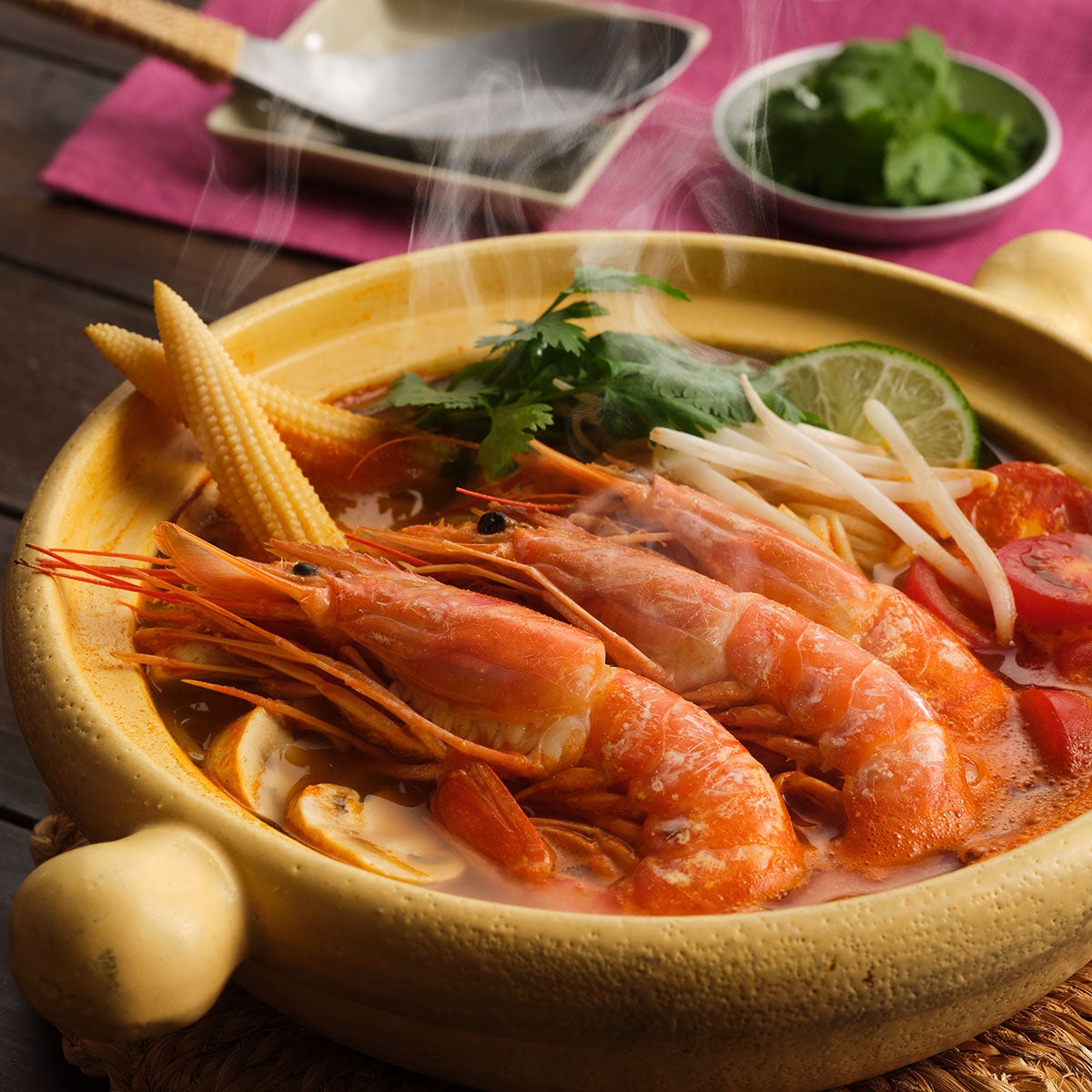 エビの旨みにハーブの香りが効いたトムヤムクン風味の鍋が手軽に楽しめます。具材は、えび、もやし、マッシュルームや水菜がおすすめ!