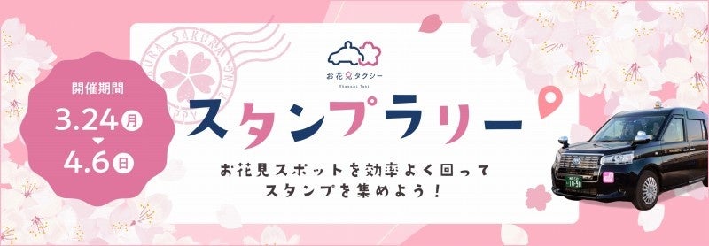 ご乗車特典:お花見スポットに近づくと、お客様ご自身のスマートフォンにデジタルスタンプを貯めることができる「スタンプラリーイベント」を開催します。参加いただいた方全員に「お花見タクシー乗車記念証」を、獲得スタンプ数に応じて日本交通オリジナルノベルティをプレゼントします。