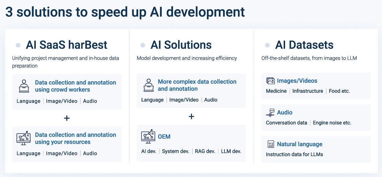 当社はこれまで、様々な画像・動画・音声・自然言語のデータ収集およびアノテーションを実施してきました。製造業における異常検知モデルの開発・精度向上や、会話データ収集をもとにした音声認識精度の向上、海外のビックテック企業に向けたLLMインストラクションデータ支援など、業種や業界に限りはございません。主な手法として、企業の独自のプロダクトに関して、各社の保有するデータをAIデータ化・構造化する。また、不足分を補うべく弊社独自のAIデータクラウドである「harBest」を活用することで、精度向上や受託開発、AIコンサルティング等の伴走支援を行ってきました。