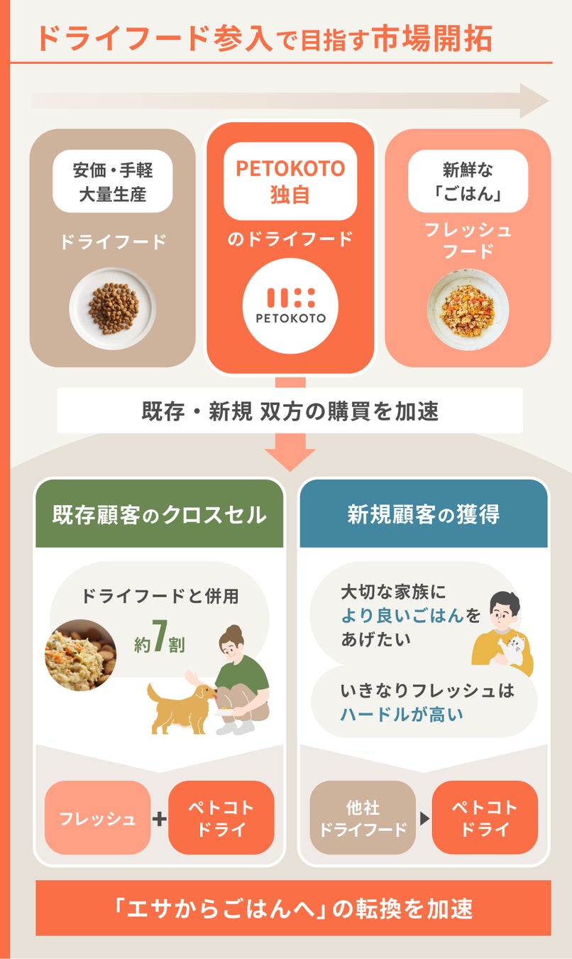 PETOKOTOが開発中のドライフードは、フレッシュフードの美味しさや新鮮さと、ドライフードの特徴である手軽さとの両立を目指すものです。フレッシュフードより低価格で、「安心安全な美味しいごはん」をより多くの飼い主とその家族へと届ける計画です。