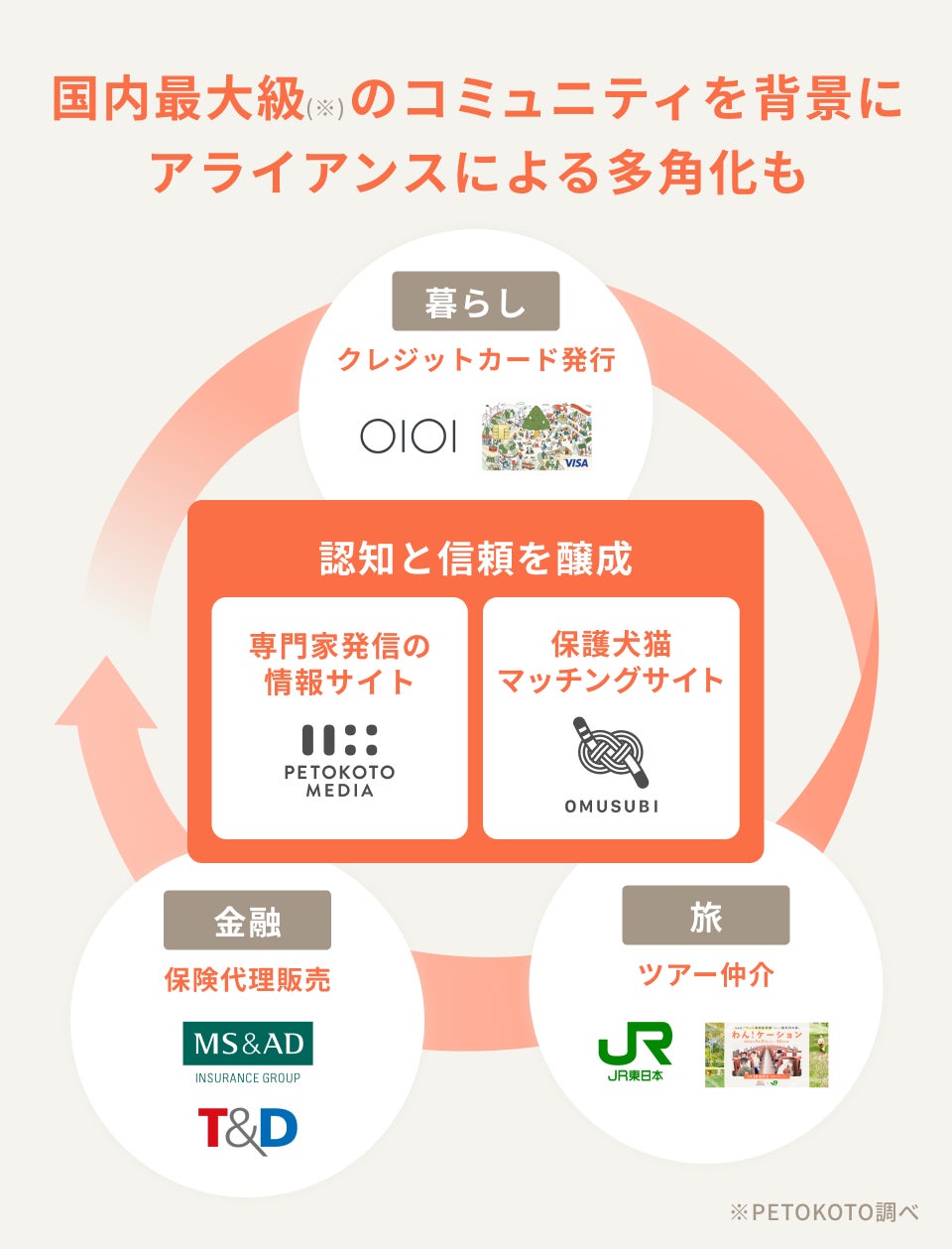 PETOKOTOはフード事業のほか、業界を超えたアライアンスを通じて医療や金融の領域にも事業を拡張しています。