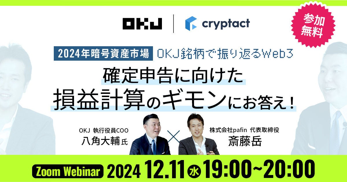 2024 年分の確定申告シーズンを迎えるにあたり、OKJでは、暗号資産の自動損益計算サービス「クリプタクト」を運営する株式会社pafinと確定申告に向けたオンラインセミナーを開催いたします。