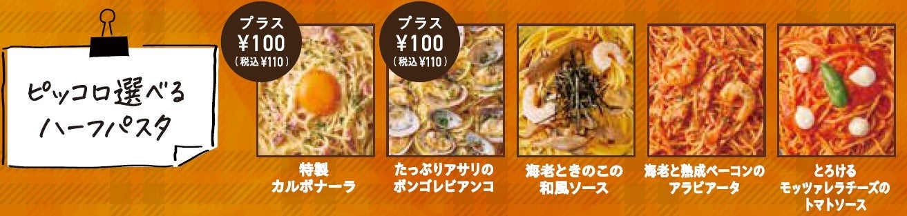 ピッコロプレートのハーフパスタは、パステルが自信をもってオススメする5品よりお選びいただけます。