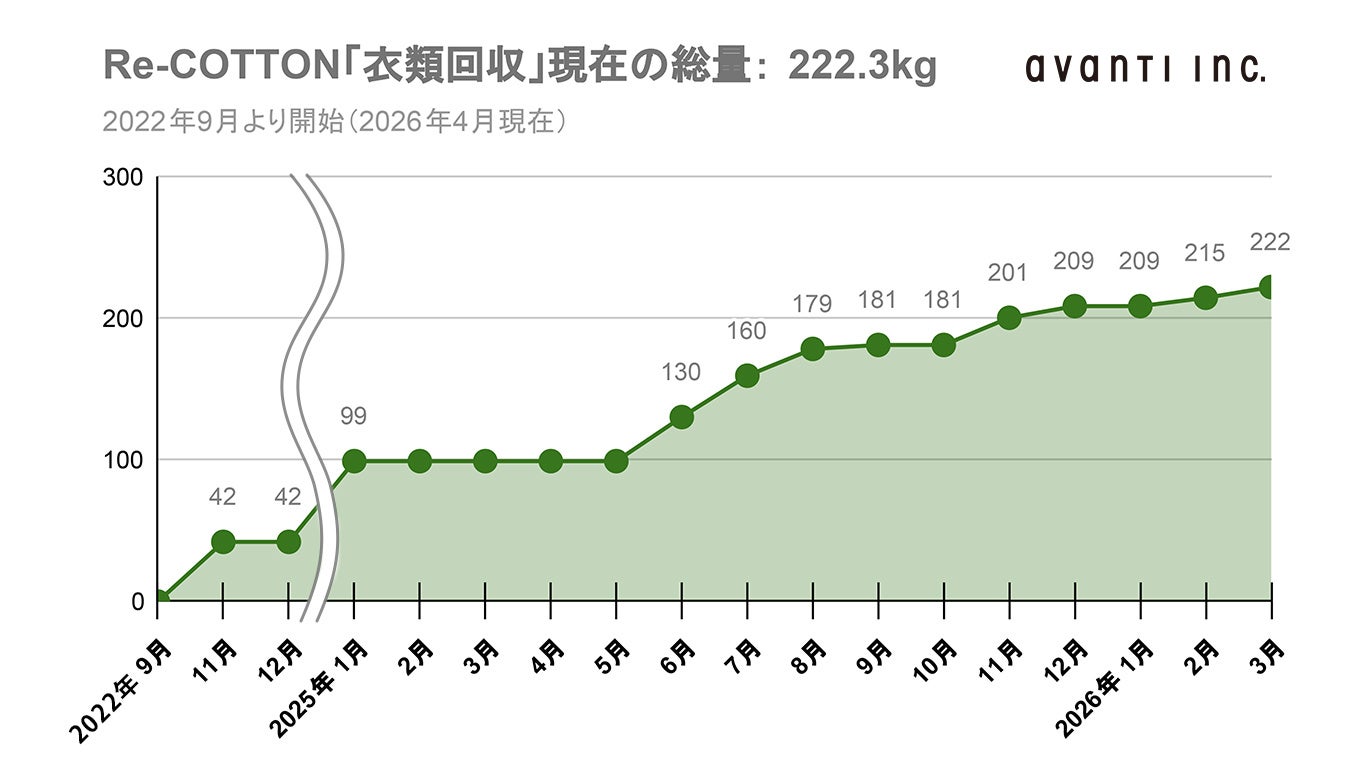 2022年9月からはお客様からの衣類回収も開始し、2026年4月現在で総量222kgの衣類が集まっています。回収された衣類は、群馬県の福祉作業所「ありさんち」に素材分別作業を依頼しており、粉砕してリコットンにするため、パーツごとに細かくカットされています。毎年5月30日の「ごみゼロの日」を機に、衣類を持ち込まれるお客様も増えています。