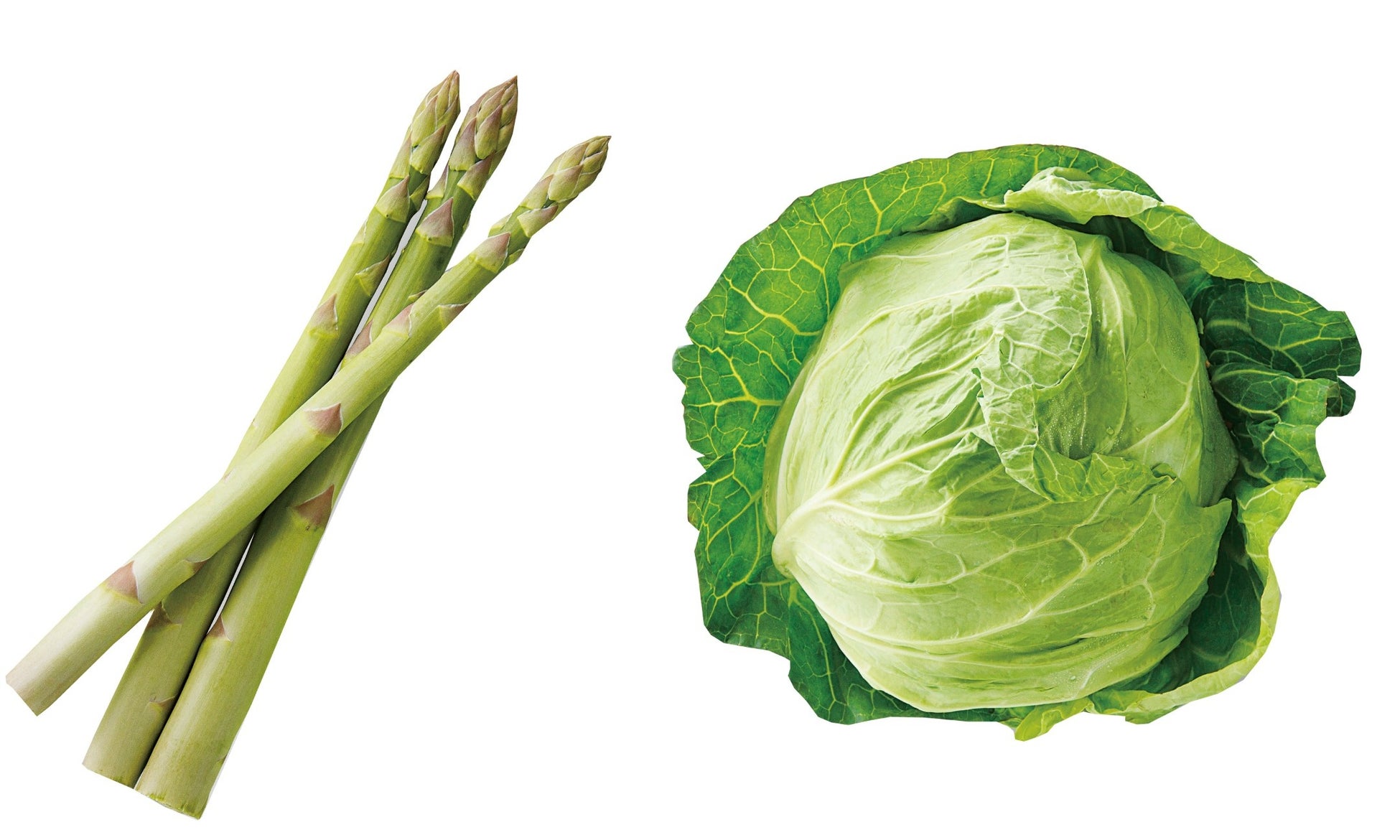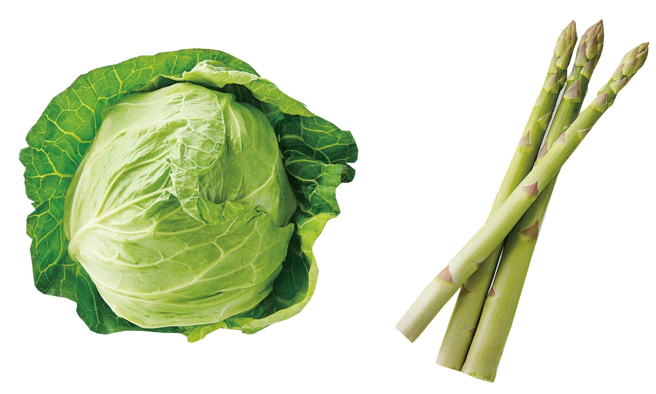 葉が柔らかく、甘みのある「春キャベツ」と春野菜としても親しまれている「アスパラガス」