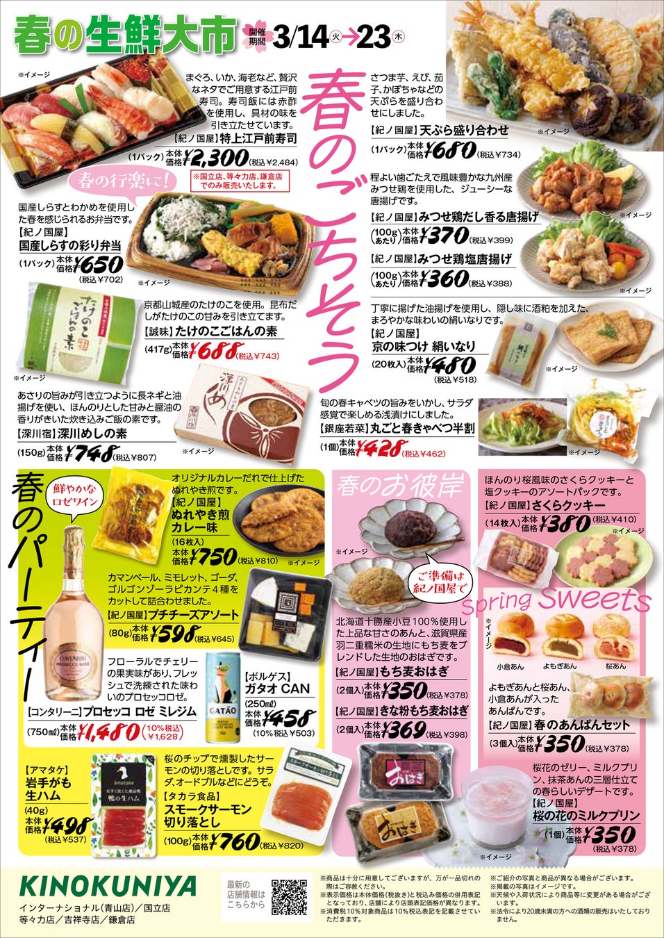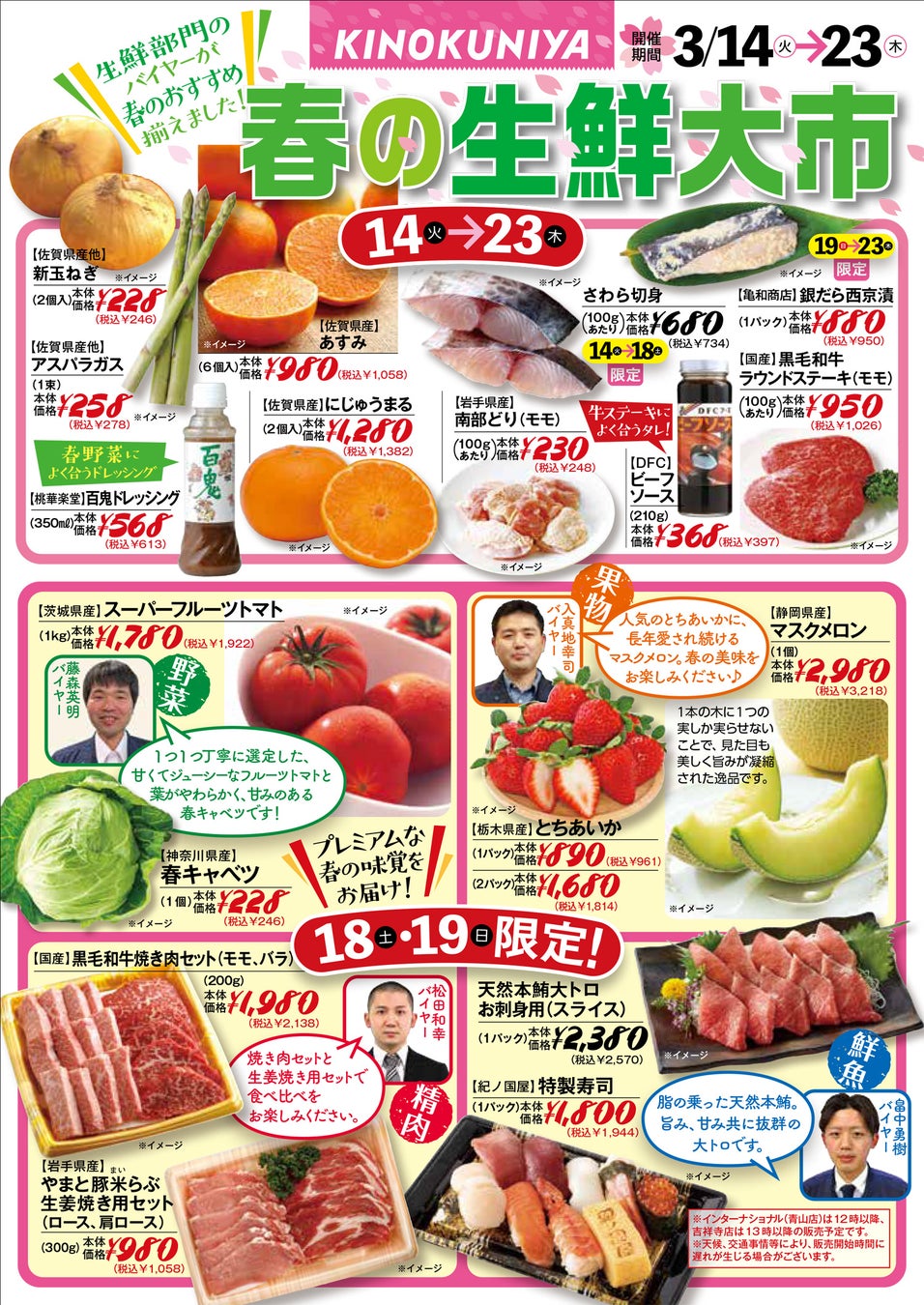 株式会社紀ノ國屋(本社:東京都新宿区市谷砂土原町3丁目5番地 代表取締役社長:富田 勝己)は、3月14日(火)より「春の生鮮大市」を開催いたします。