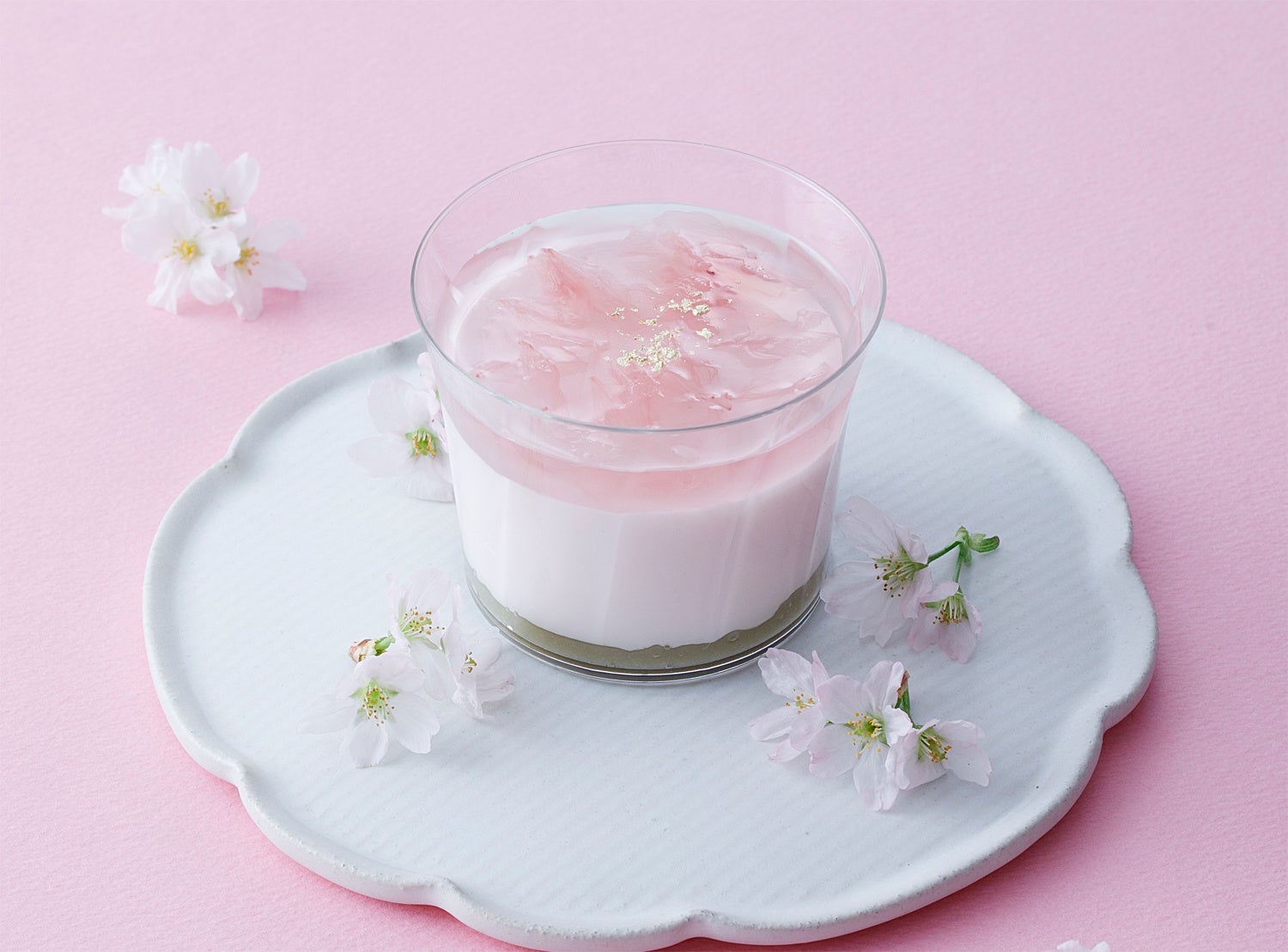 優しい甘さが絶妙。桜の花が浮かぶゼリー層はふんわりと桜の香りが広がります。一度に三つの味わいを楽しめる季節のデザートです。