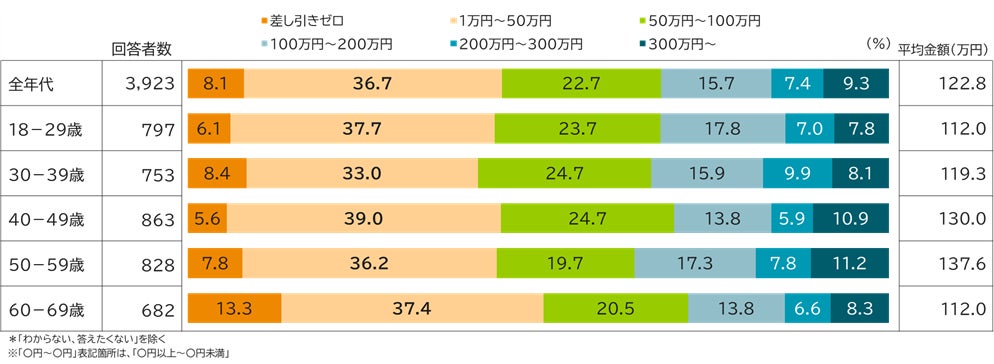 一方で、平均額を見ると、全年代の平均は年間123万円であり、単純計算で月額10万円程度が資産形成に回っていることになります。これは年代が上がるにしたがって若干増加していきます。
