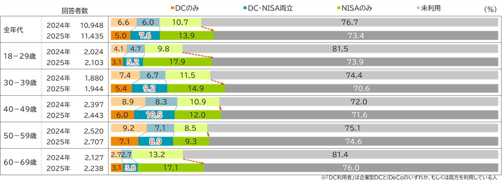 特に、「DC・NISA両立」の割合がどの年代でも増えていることも特徴です。