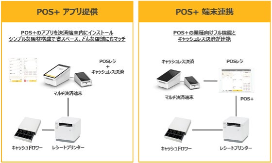 「POS+」は、オールインワン決済端末「stera terminal(ステラターミナル)」(*1)や「JT-VT10/JT-VC10」(*2)を決済端末として金額連携し活用したり、ポスタスが提供しているアプリケーション「POS+ retail(ポスタス リテイル)」を決済端末自体へインストールし活用することで、キャッシュレス決済や、POSレジ機能の利用、全拠点の一括管理を実現しています。